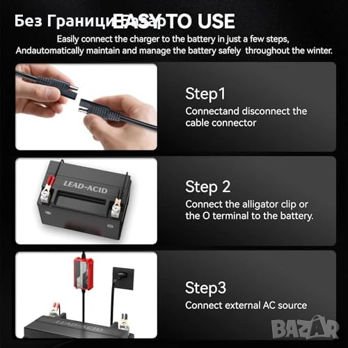 12V интелигентно автоматично зарядно 1000mA за оловно-киселинни акумулатори: SLA/VRLA, AGM, GEL, WET