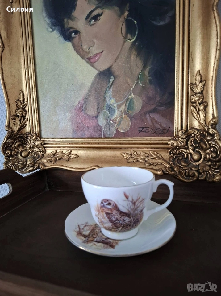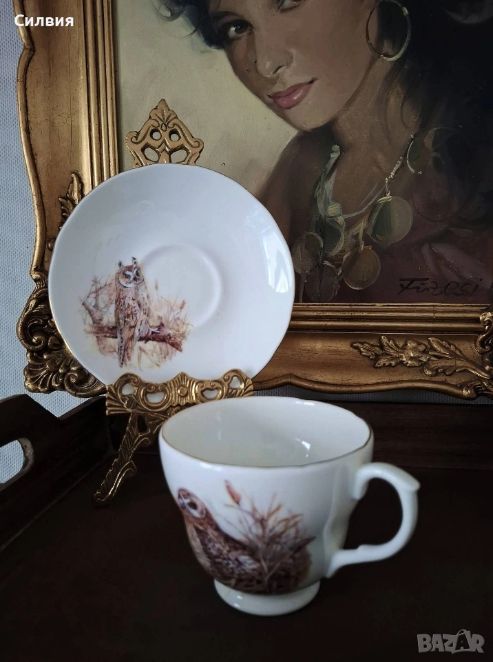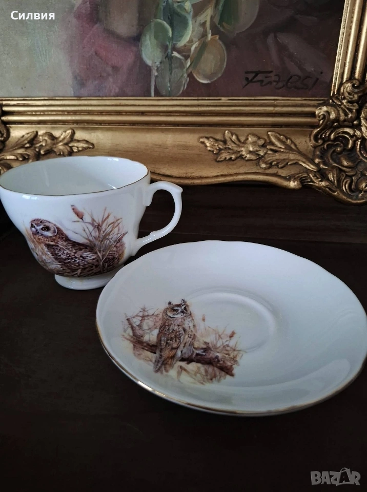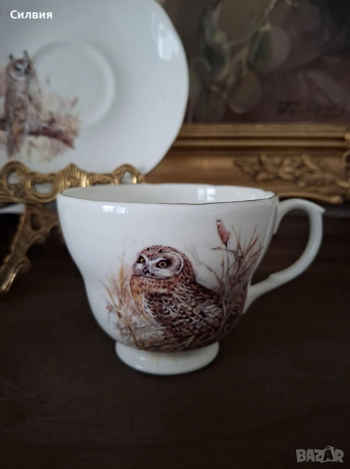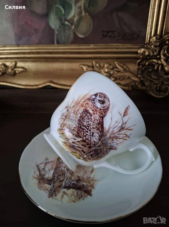 Винтидж английски комплект – чаша с чинийка от фин костен порцелан (300 мл) Очарователна класическа английска елегантност в този изискан винтидж комплект. Изработен от висококачествен костен порцелан, той впечатлява с изключителна лекота, финес и прозрачно бяла глазура. Голяма вместимост от 300мл. Декориран с нежни художествени илюстрации на горски птици – топли, детайлни и изпълнени с характер. Златистият кант допълва ретро стилистиката и придава усещане за истински колекционерски предмет. Подходящ като елегантен акцент в интериор или колекция от ретро сервизи. Състояние: отлично, и запазил цялото си винтидж очарование. Цена 2️⃣8️⃣€ 《54,76лв》 •✽✧✽•°”˜🦉”°•✽✧✽•°”˜🦉”°•✽✧✽•°”˜🦉”°•✽✧✽•°”🦉˜”°•✽✧✽•