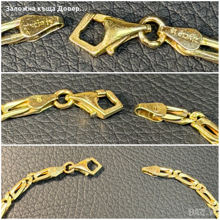 Всички изделия,които предлагаме са изработени от 14 каратово злато с проба 585 с печати и сертификат.Посочената цена не подлежи на НИКАКЪВ КОМЕНТАР И ПАЗАРЛЪК!!