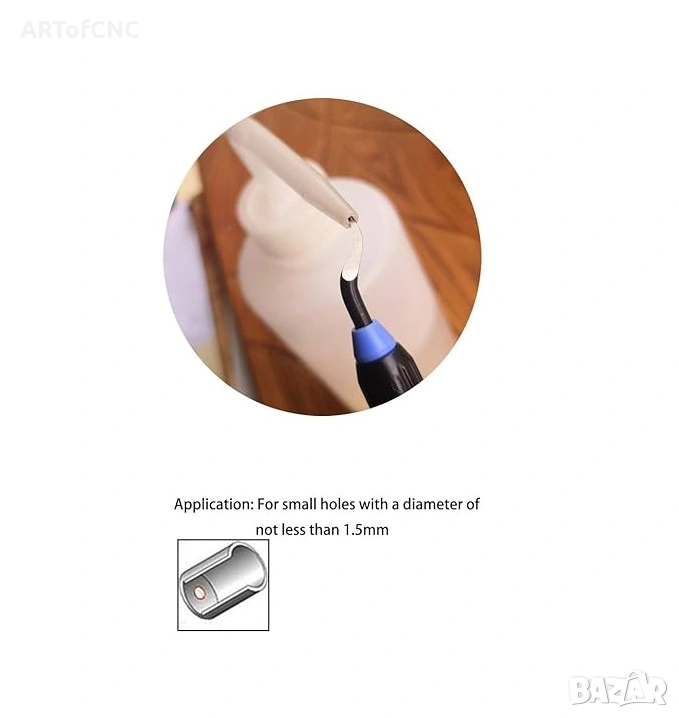 Универсално острие. Съвместимо със стандартните дръжки за ротационни шабри с диаметър на остта 1/8 инча (3,175мм). Подходящо за финна работа при малки детайл. Може да обработва отвори с минимален диаметър 1,5мм. Работен ъгъл 45 градуса. Подходящо е за работа със стомана, алуминий и пластмаса. Подходящо е за десничар. Обявената цена е за 1бр. острие.