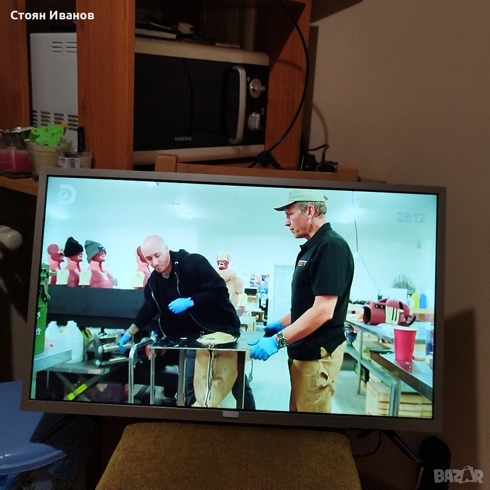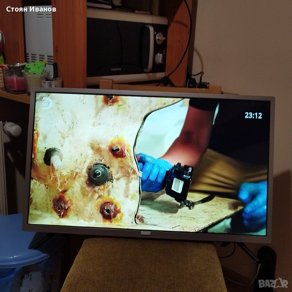 Телевизора работи отлично с дистанционно и крачета. Модела се вижда на една от снимките