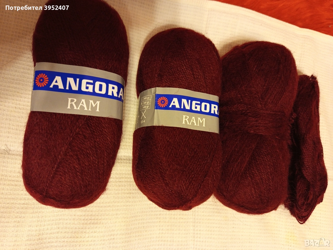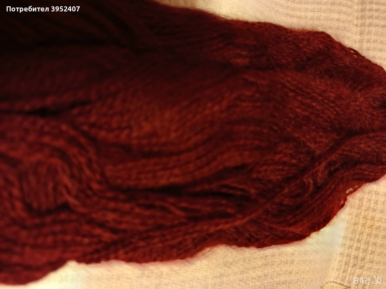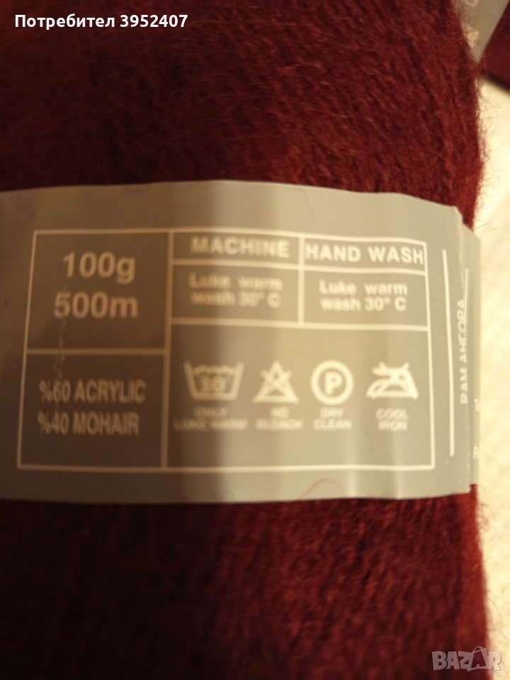 Красива прежда с 40 процента мохер с наситен бордо цвят, 320 грама, 9 евро за тях.