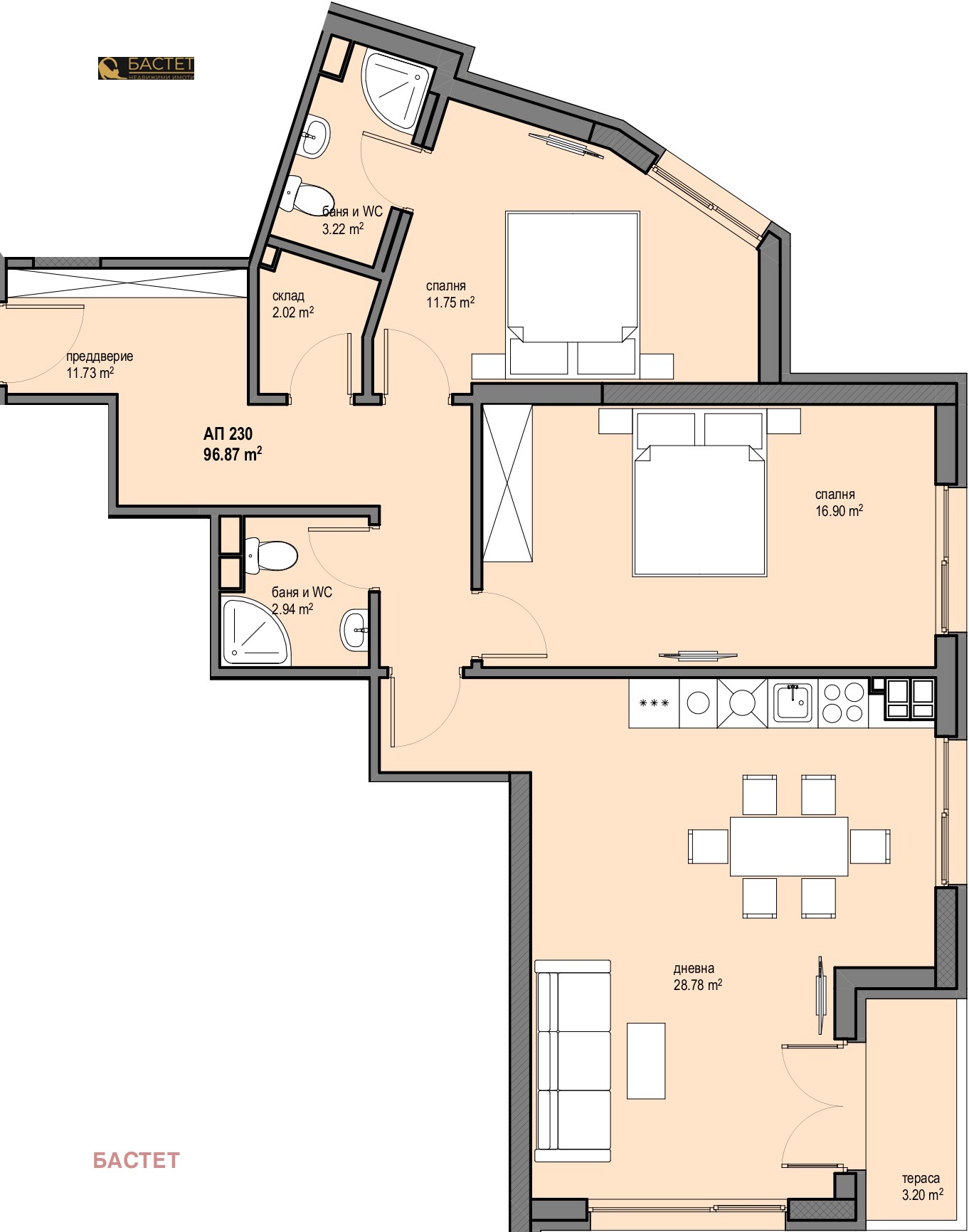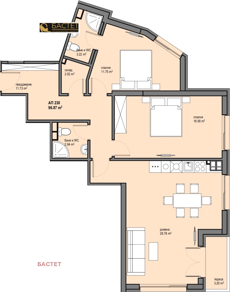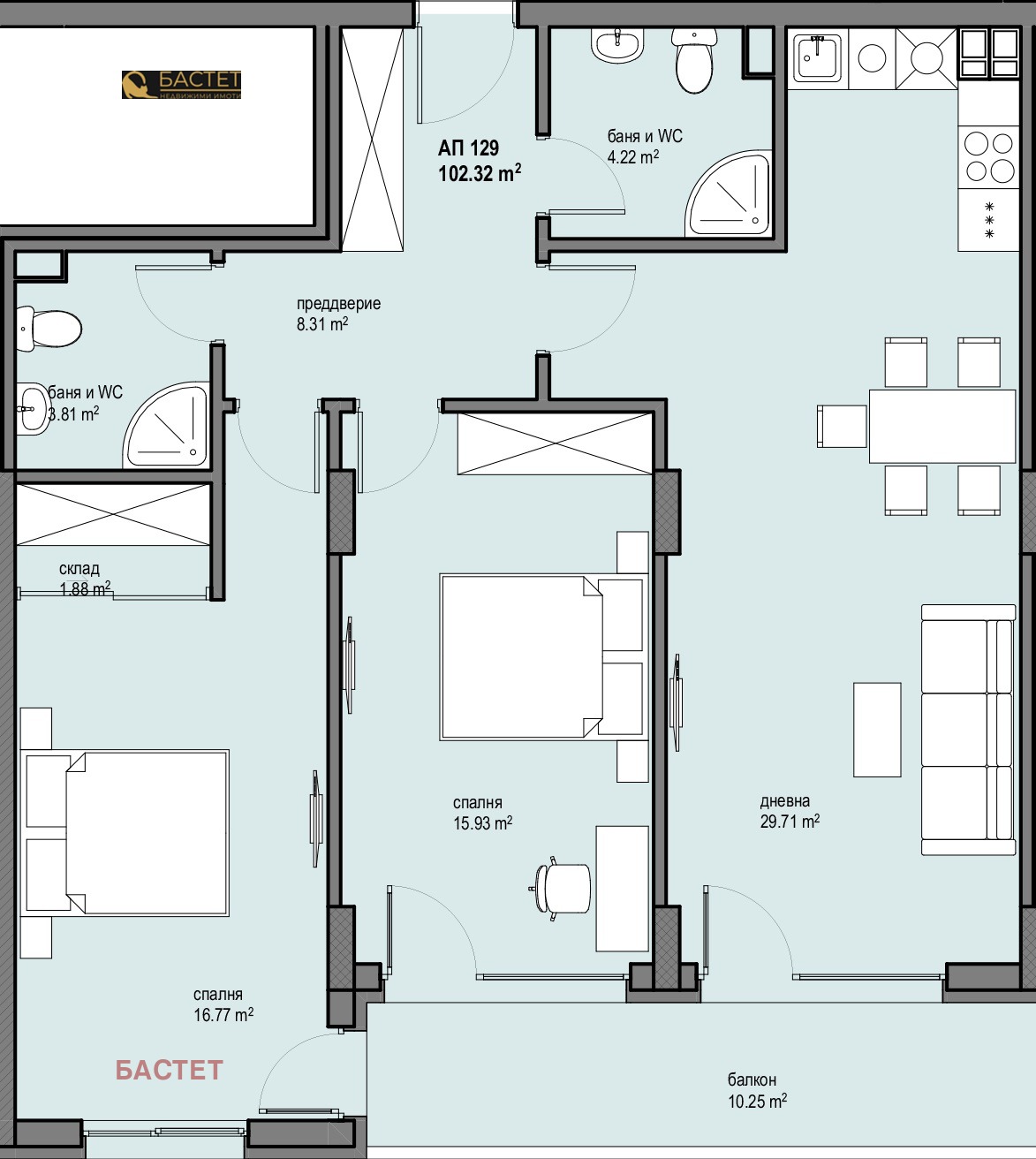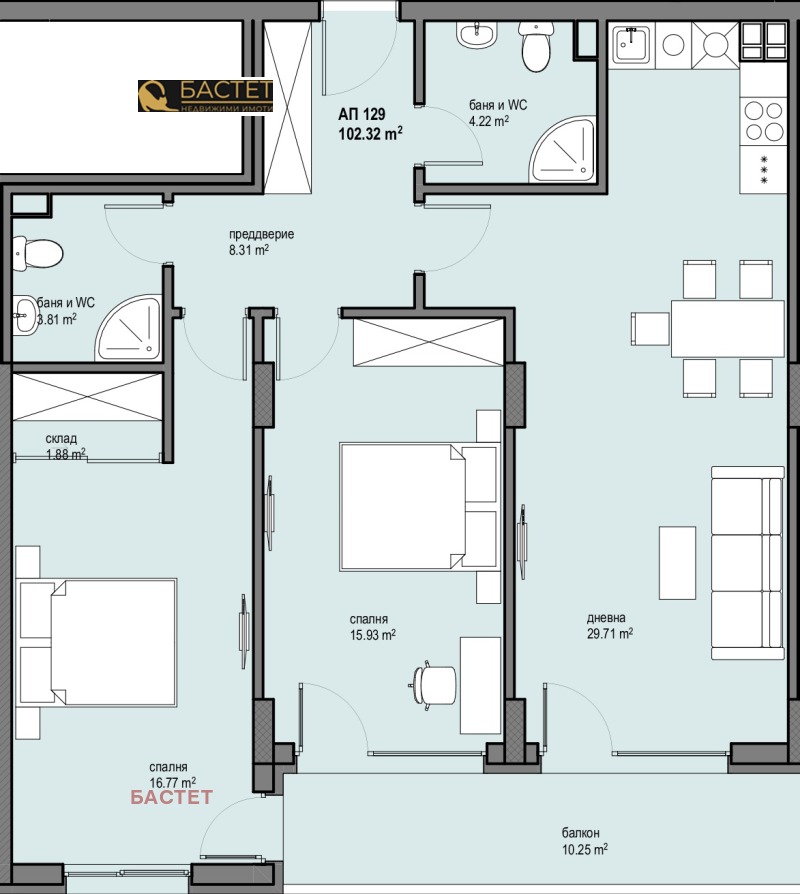 дневна с трапезария и кухненски бокс 29.71 кв.м,