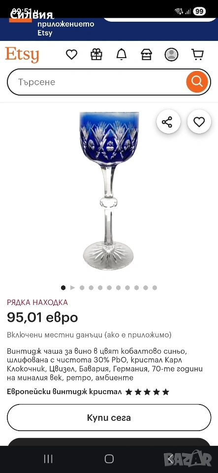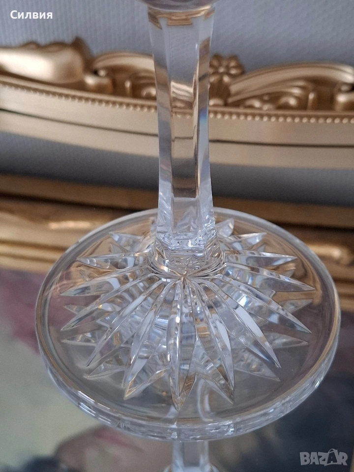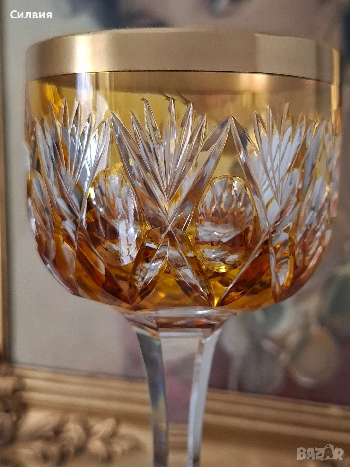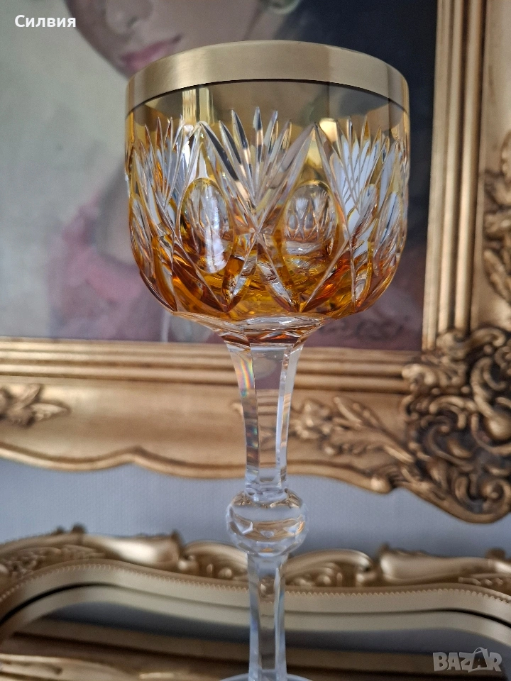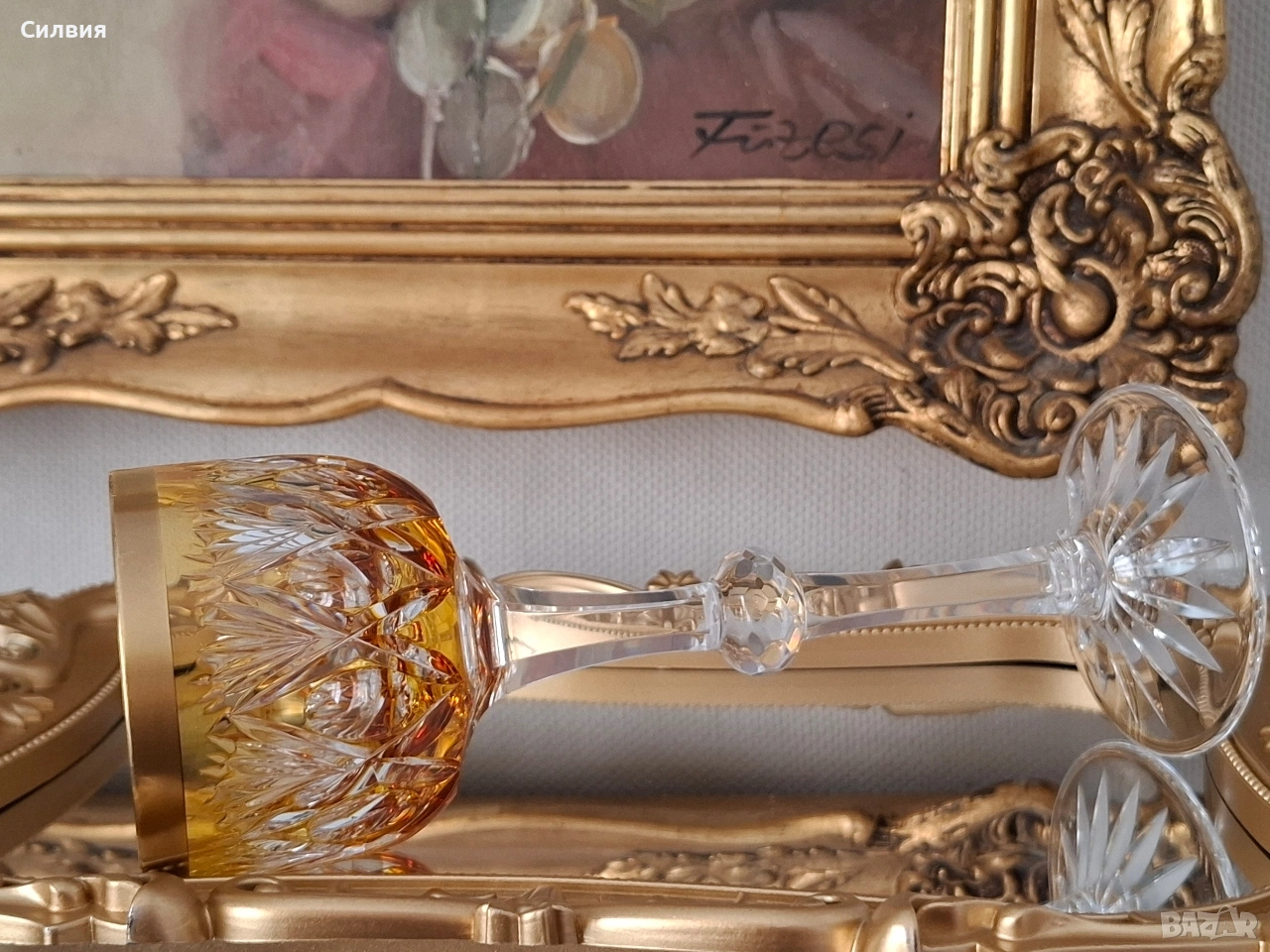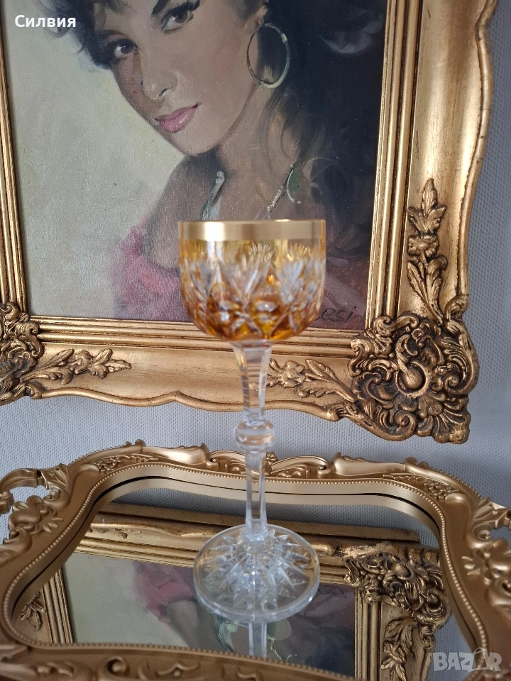 Винтидж шедьовър на Karl Klokotschnik Изящна, колекционерска чаша, родена в сърцето на Бавария. Изработена от висок клас оловен кристал (30% PbO) през 70- те години в легендарната работилница Glashütte Karl Klokotschnik (Zwiesel), истинско бижу за ценители. Дълбоките, ръчно изрязани фасети пречупват светлината в хиляди нюанси, създавайки неповторима игра на отблясъци. Висококачественият златен кант придава завършен аристократичен вид и подчертава кехлибарените нюанси на кристала. Стройна и висока (20,5 см), тя завършва с деликатно „диамантено“ пречупване, което осигурява перфектен захват и естетическа наслада. Масивен, тежък кристал. Състоянието е безупречно – сякаш току-що е извадена от витрината на баварски замък. Тази чаша е идеална за специални моменти, в които времето спира. Със своята вместимост от 150 мл, тя е перфектна за дегустация на отлежали питиета, превръщайки всяка глътка в церемония. Единствен екземпляр за вашата колекция, носещ духа на стария свят и немското качество. Цена 8️⃣0️⃣€ 《156,47лв 》