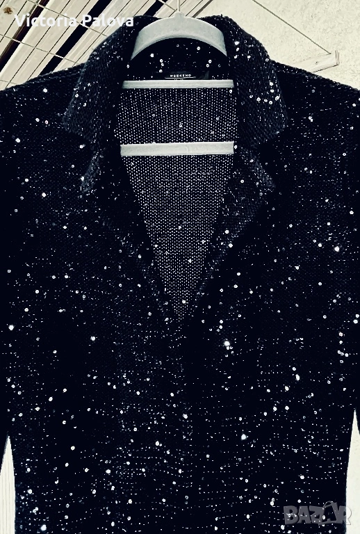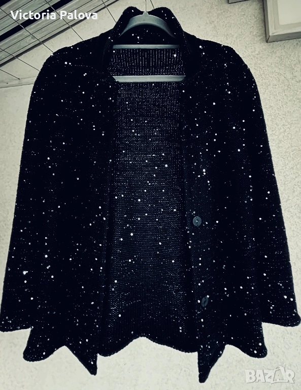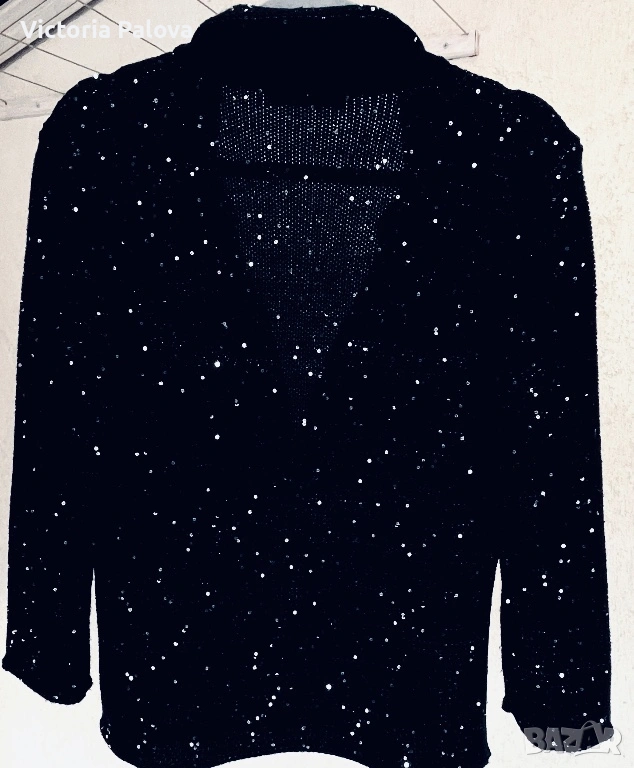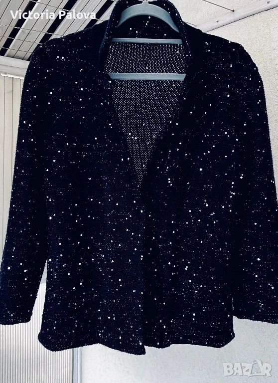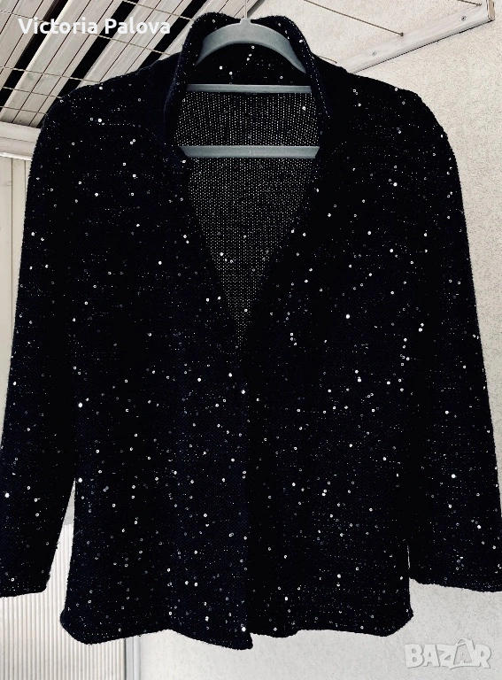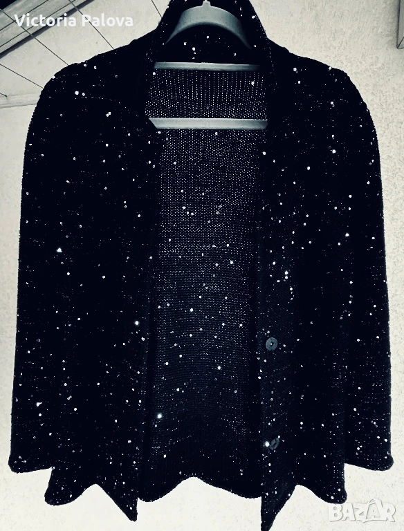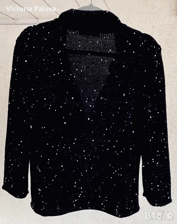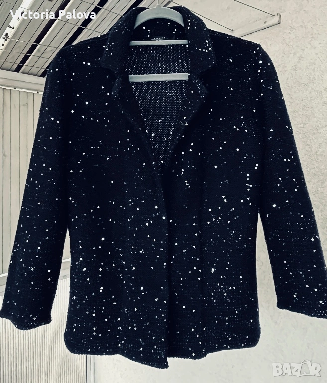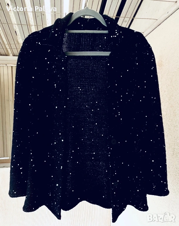 MaxMara е скъпа модна къща, която определя стандартите на италианска елегантност и безупречно качество. Жилетката е изработена от премиум вълна, мека и топла, а разпръснатите пайети създават магически ефект на блестящо звездно небе, подчертавайки ослепителна елегантност. С класическа кройка, скрити копчета отпред и перфектно състояние тази жилетка запазва блясъка си години напред и осигурява неотразимостта на притежателката ѝ. Рамо - 44см, ГО - 50см, дължина - 60см, ръкав - 55см.
