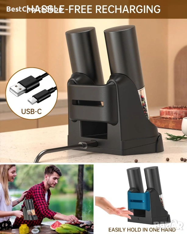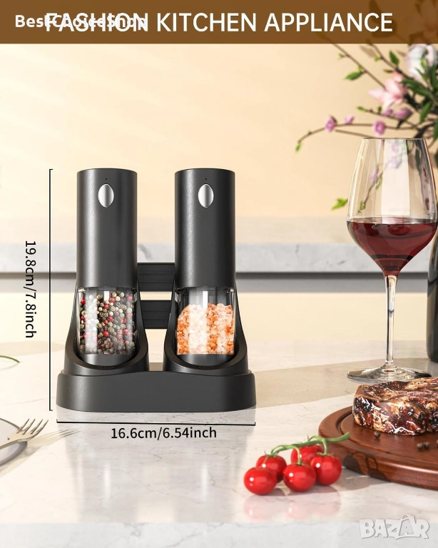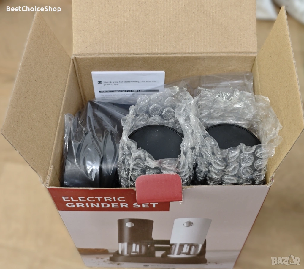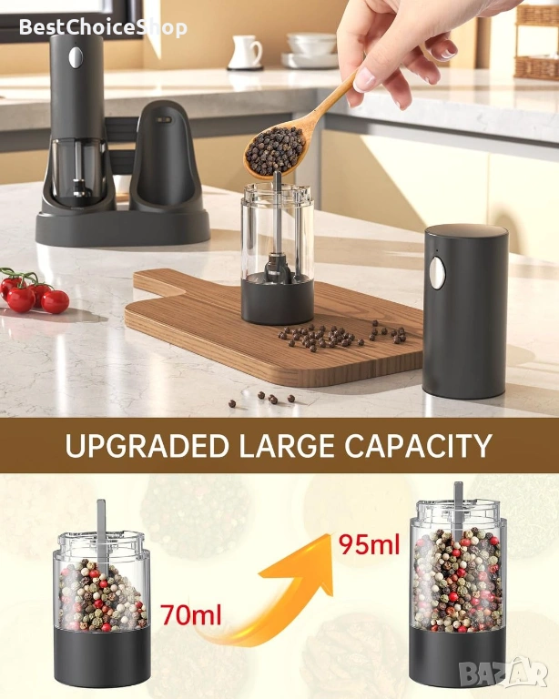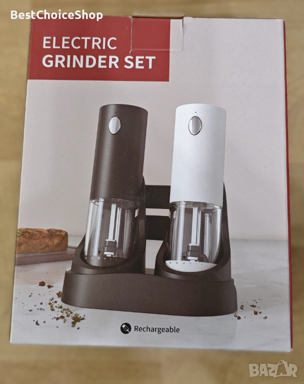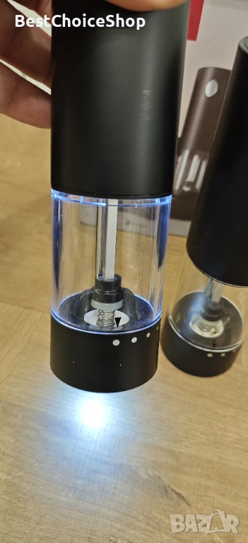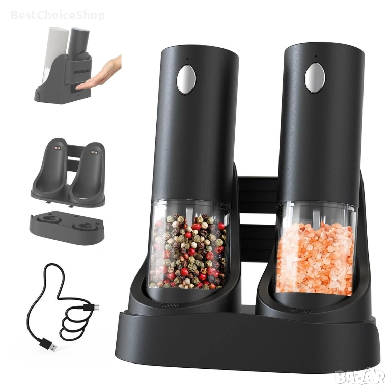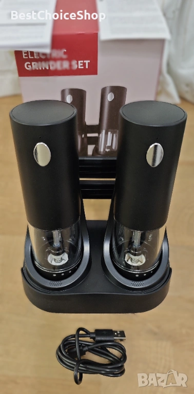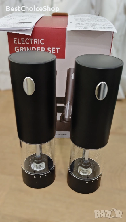 Модерен и практичен комплект електрически мелници за сол и пипер, подходящ за всяка кухня. Работят с едно натискане на бутон и осигуряват бързо и равномерно смилане.