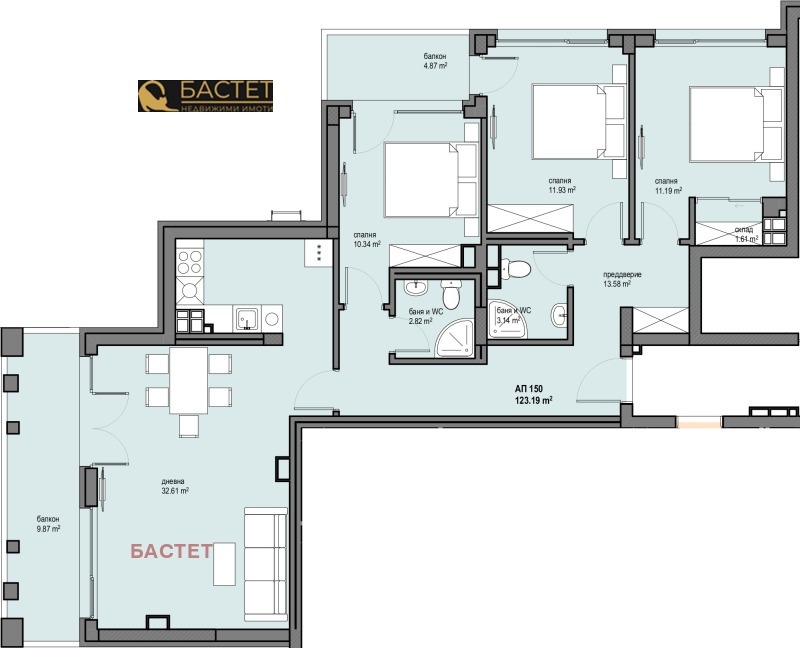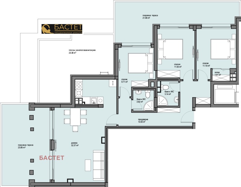 просторна дневна с трапезария и обособен кухненски бокс - 32.61 кв.м,