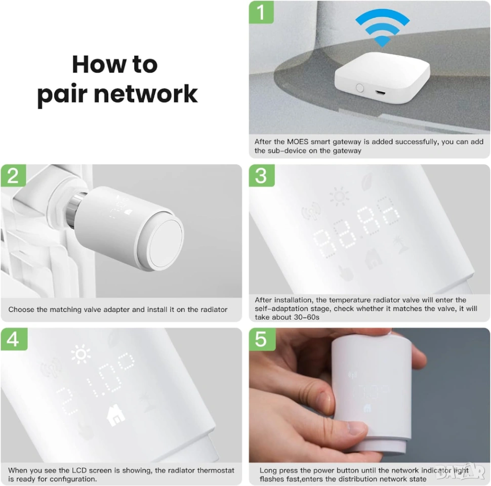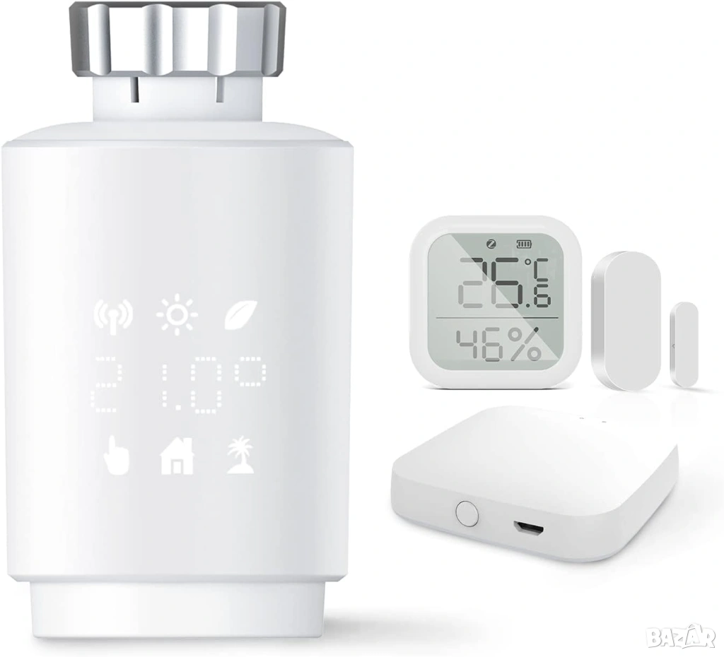 Съдържание на кутията: 1 x интелигентен домашен радиаторен термостат, 2 x AA батерии, 6 x комплект адаптери, 1 x контакти за прозорец на вратата. 1 x Термометър и хигрометър