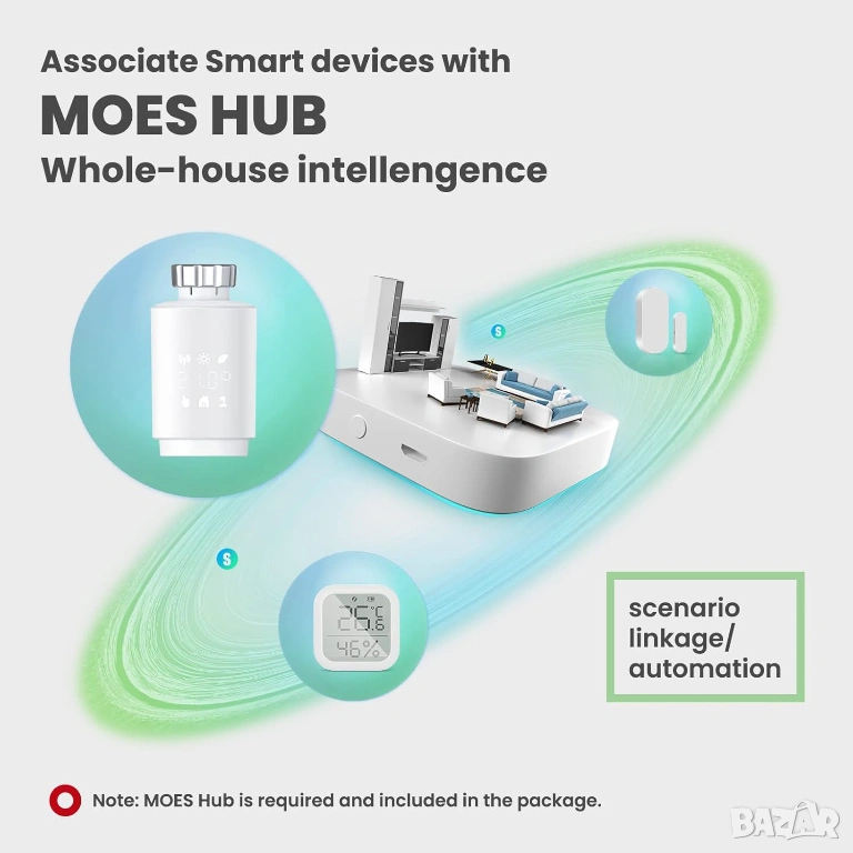 Контрол чрез приложение и глас: Moes Gateway е незаменим аксесоар за интелигентни термостати. След като устройството е свързано, мобилният телефон може да управлява термостата за отопление чрез приложението Moes/Smart Life/Tuya или с прости гласови команди чрез Alexa и Google Assistant