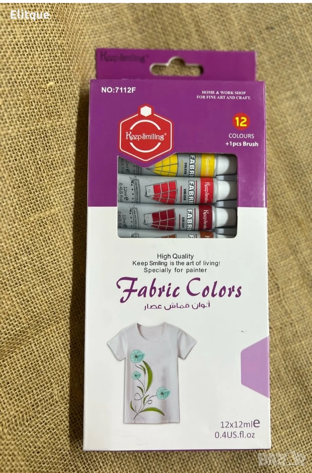 Бои за текстил – 12 цвята Fabric Colors Keep Smiling Комплект бои за текстил, подходящ за декорация, персонализиране и освежаване на дрехи и текстилни изделия. Съдържа 12 различни, наситени цвята, които позволяват създаване на уникални дизайни и рисунки върху плат. Боите са предназначени за работа върху светли материи и са лесни за нанасяне, което ги прави подходящи както за начинаещи, така и за любители на текстилното изкуство и ръчната изработка. Подходящи за: Памук Лен Коприна Коноп Смесени тъкани с до 20% изкуствени влакна (без допълнителни покрития) Предимства: 12 различни цвята в комплект Универсално приложение Подходящи за светли материи Идеални за творчество, хоби и персонализация Лесни за използване Доставка с Еконт с опция преглед и тест до 3 работни дни.