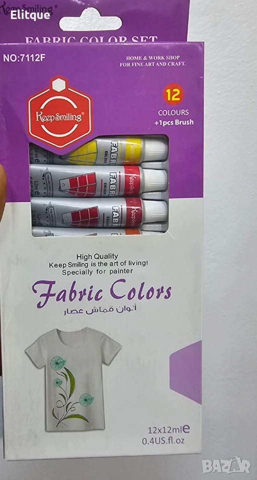 Бои за текстил – 12 цвята Fabric Colors Keep Smiling Комплект бои за текстил, подходящ за декорация, персонализиране и освежаване на дрехи и текстилни изделия. Съдържа 12 различни, наситени цвята, които позволяват създаване на уникални дизайни и рисунки върху плат. Боите са предназначени за работа върху светли материи и са лесни за нанасяне, което ги прави подходящи както за начинаещи, така и за любители на текстилното изкуство и ръчната изработка. Подходящи за: Памук Лен Коприна Коноп Смесени тъкани с до 20% изкуствени влакна (без допълнителни покрития) Предимства: 12 различни цвята в комплект Универсално приложение Подходящи за светли материи Идеални за творчество, хоби и персонализация Лесни за използване Доставка с Еконт с опция преглед и тест до 3 работни дни.