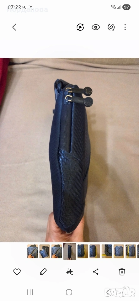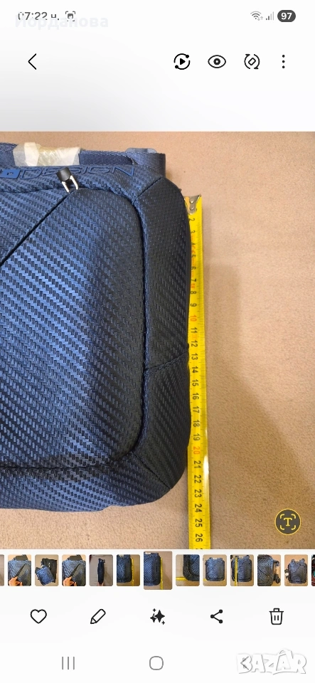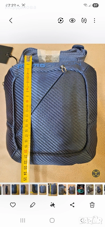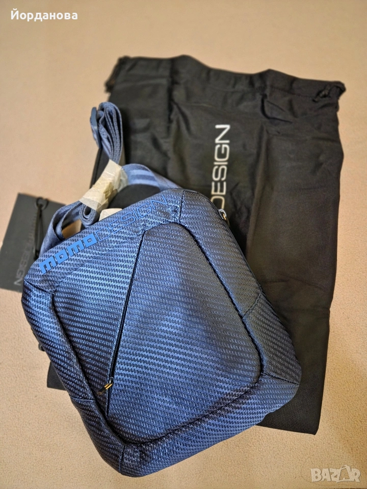 Нова, с етикет боди чантичка за през рамото в тъмно син цвят и размури 21см/24 см. Има цип отвън по диагонал и вътре. Върви с противопряхова торба.