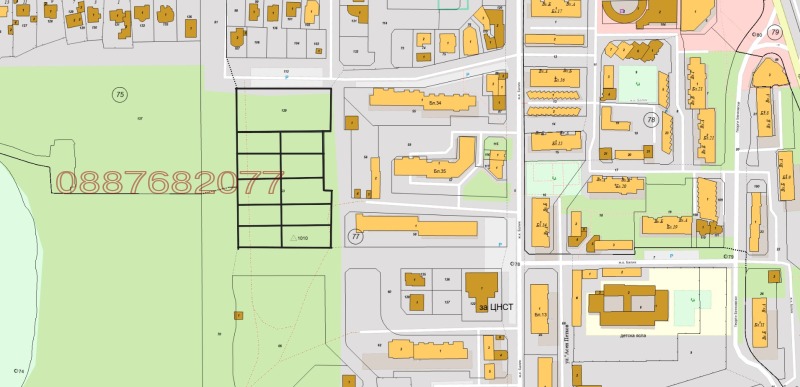 Парцел с правилна правоъгълна форма, с лице на три пътя, КИНТ 3, застрояване 80 %, височина 15 м., кота корниз, строеж срещу обезщетение. Кадастрален номер 02508.77.129.