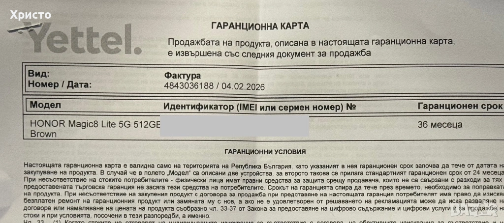 Предлагам чисто нов и неразпечатан HONOR Magic 8 Lite – последен модел на марката. Телефонът е закупен на 4 Февруари 2026 г. и разполага с 36 месеца гаранция. Работи безпроблемно с всички оператори.