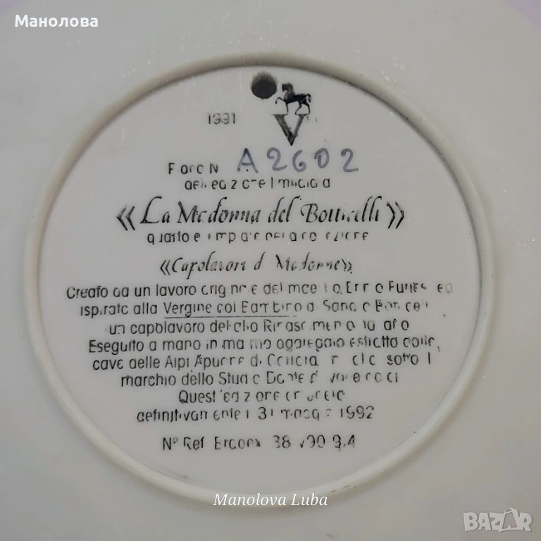 Копие на "La Madonna del Boutcelli" (Мадоната на Ботичели) създадено на ръка. Ограничено издание, окончателно закрито на 31 май 1992 г. № Ref Ercoex 38/90 9.4., форма № A2602.
