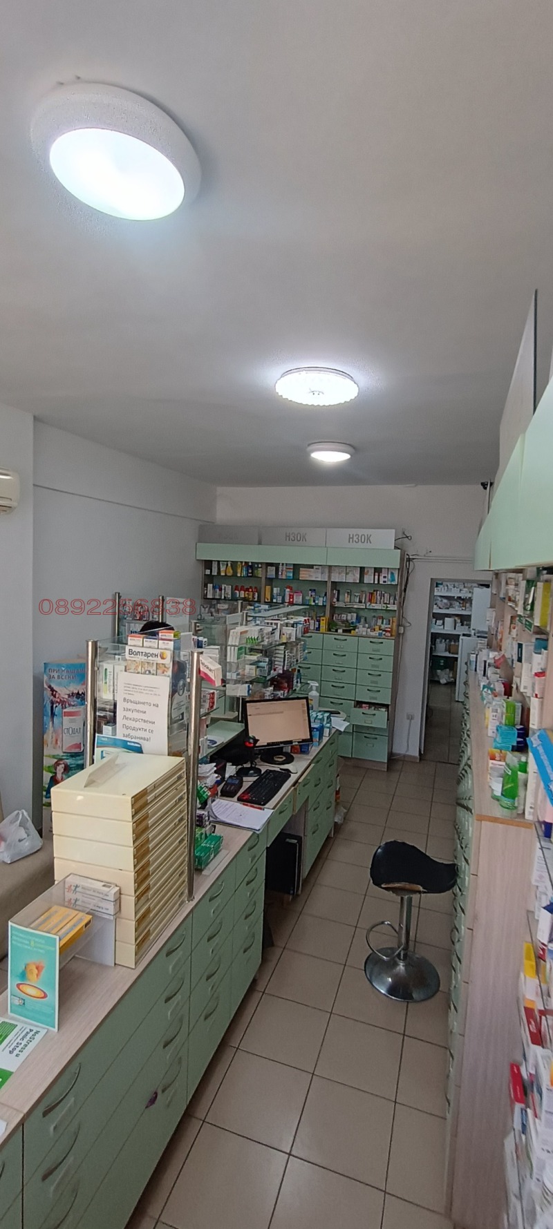 Аптеката е с обща площ 35 кв.м и включва търговска зала, складово помещение и санитарен възел. Пространството е практично разпределено и поддържано в отлично състояние.