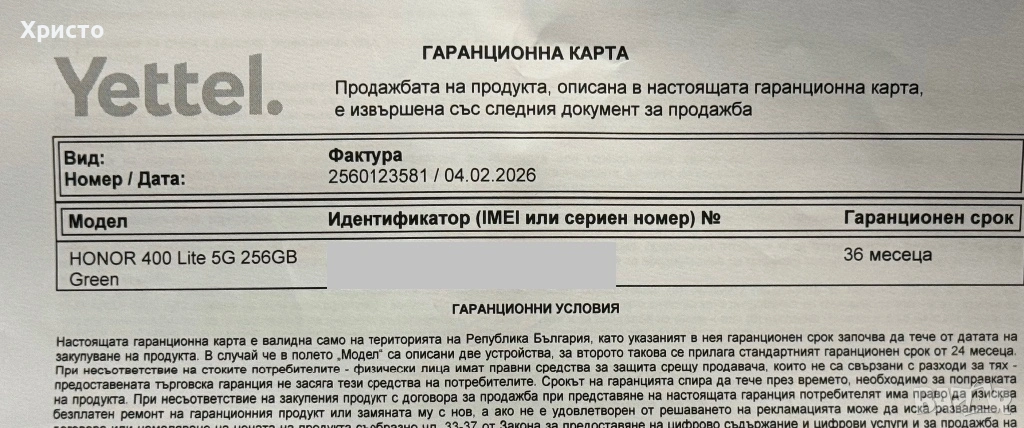 Предлагам чисто нов и неразпечатан HONOR 400 Lite – последен модел на марката. Телефонът е закупен на 4 Февруари 2026 г. и разполага с 36 месеца гаранция. Работи безпроблемно с всички оператори.