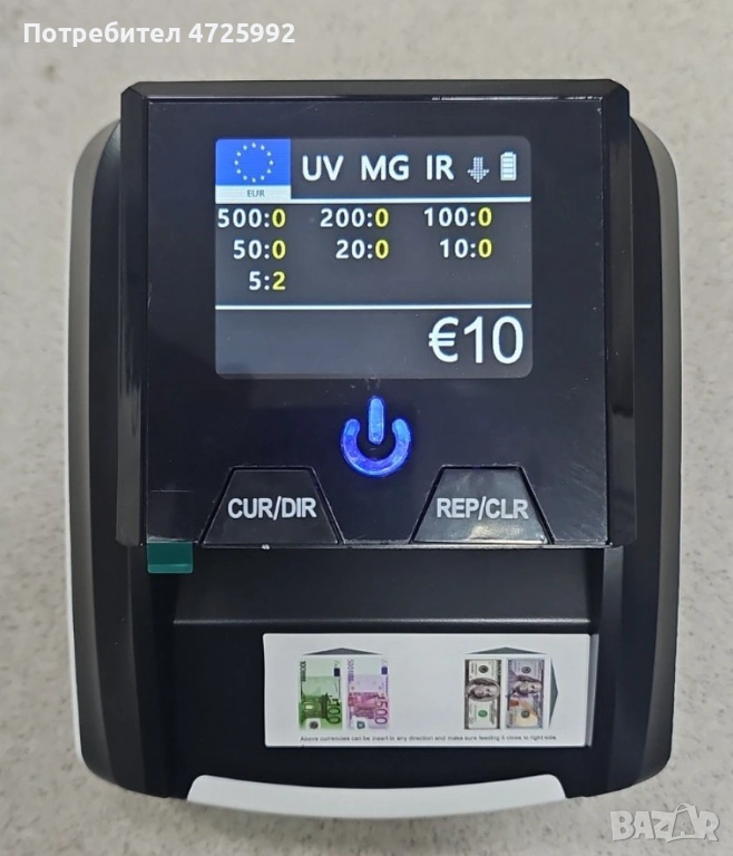 Функции: автоматично разпознаване, броене на стойности, броене на брой банкноти;