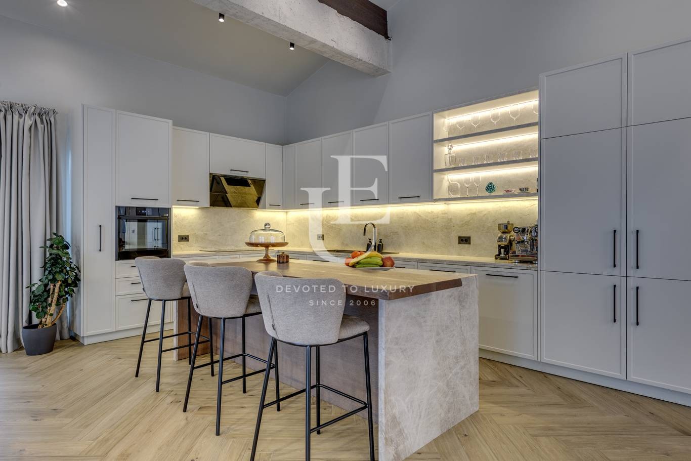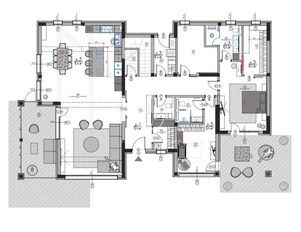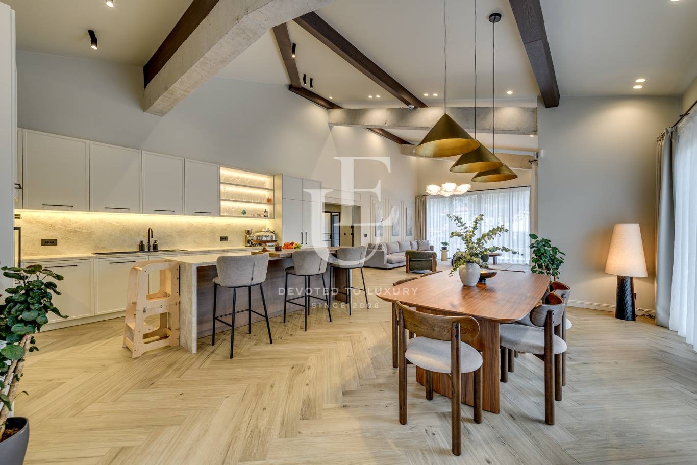 Дневната е просторна и светла, с големи прозорци, обединяваща трапезария и кухненска част - сърцето на дома, създадено за незабравими вечери с приятели и семейство. На разположение са три спални, всяка внимателно обзаведена, с възможност за обособяване на четвърта и пета спалня според нуждите на собствениците. Имотът разполага с професионално оборудвана фитнес зона, стилен работен кабинет, мокро помещение и гараж за два автомобила.