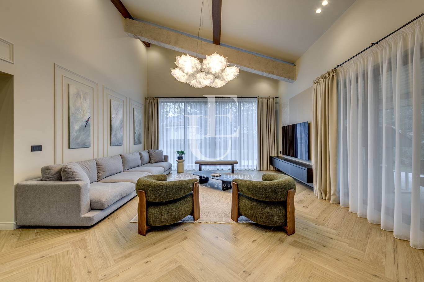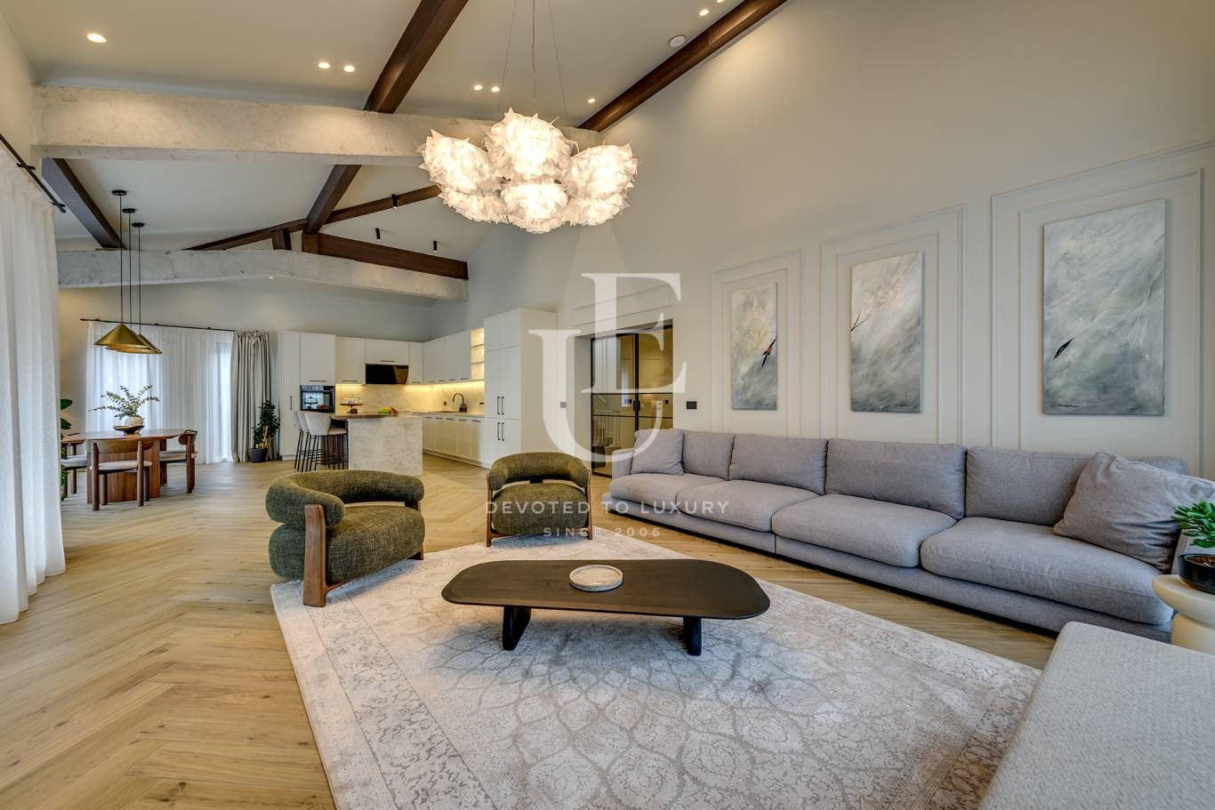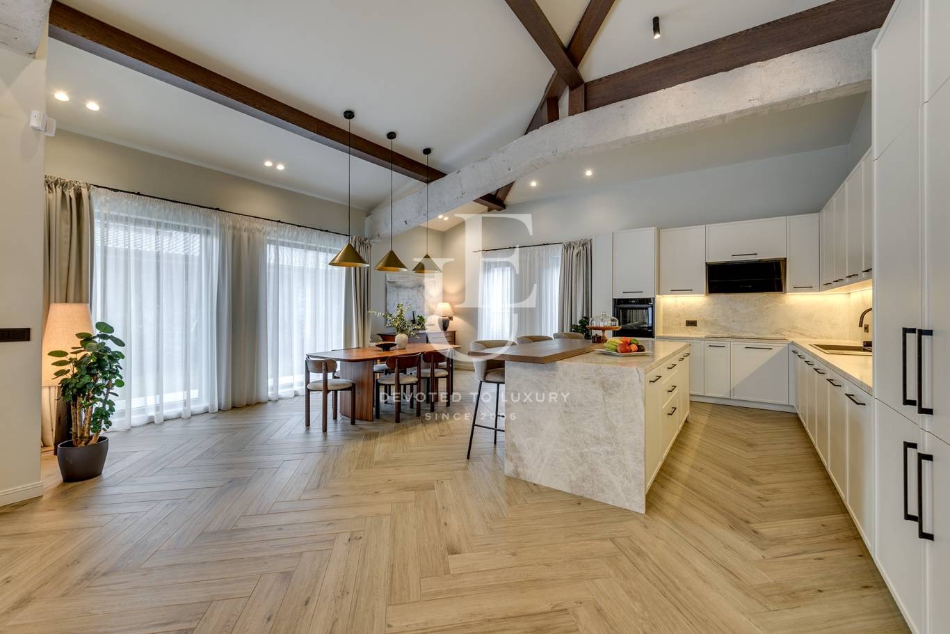 Дневната е просторна и светла, с големи прозорци, обединяваща трапезария и кухненска част - сърцето на дома, създадено за незабравими вечери с приятели и семейство. На разположение са три спални, всяка внимателно обзаведена, с възможност за обособяване на четвърта и пета спалня според нуждите на собствениците. Имотът разполага с професионално оборудвана фитнес зона, стилен работен кабинет, мокро помещение и гараж за два автомобила.