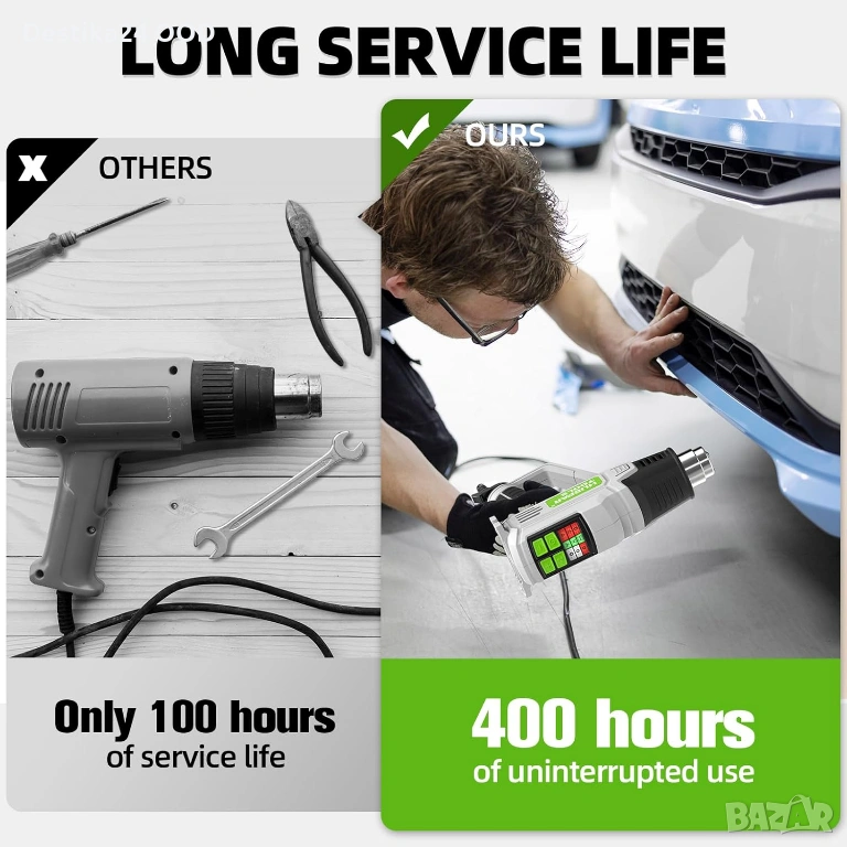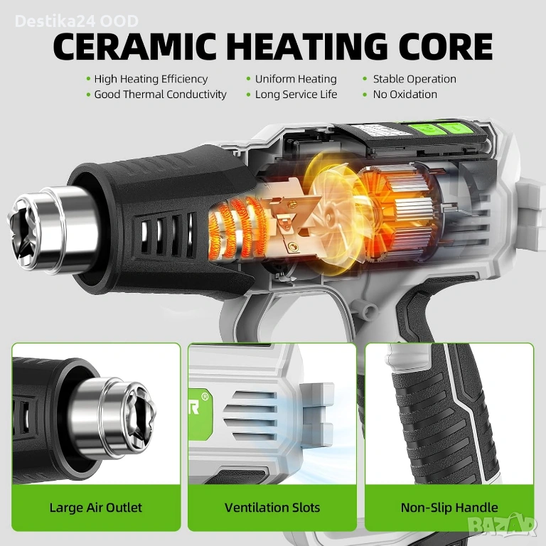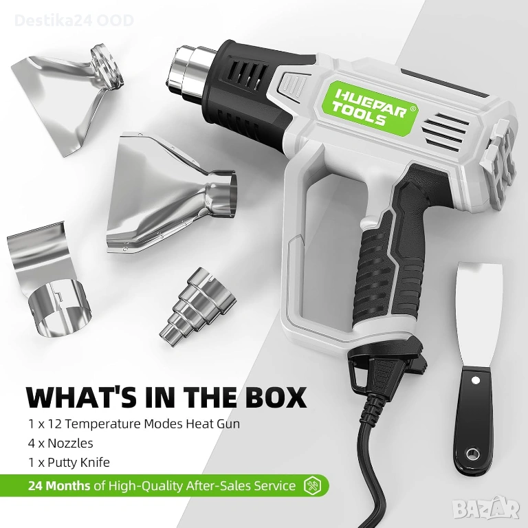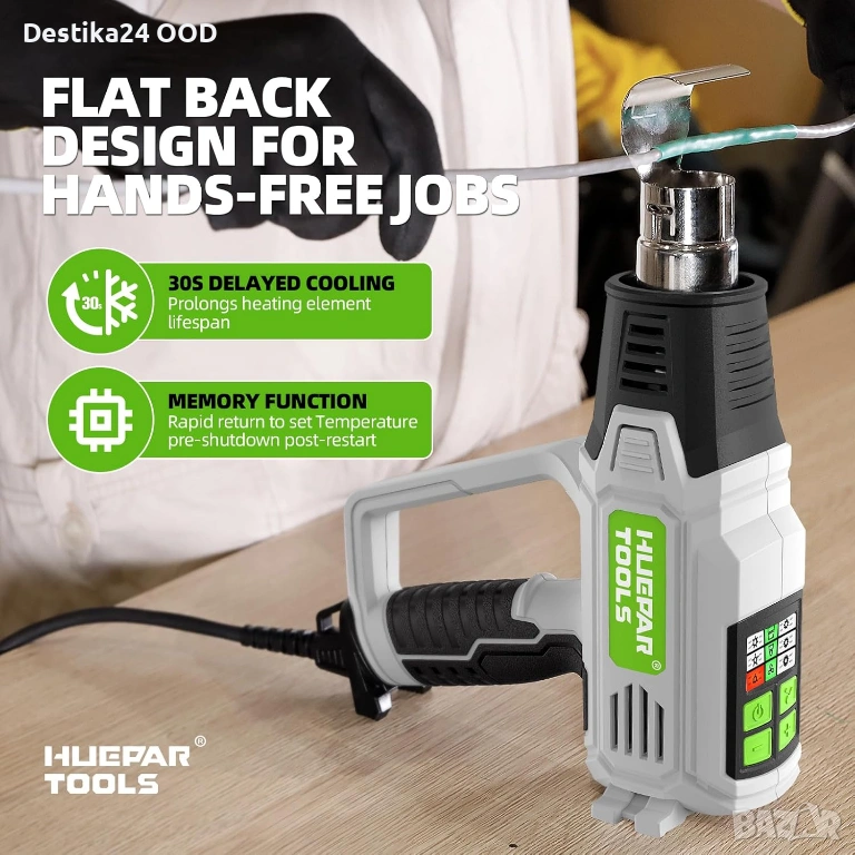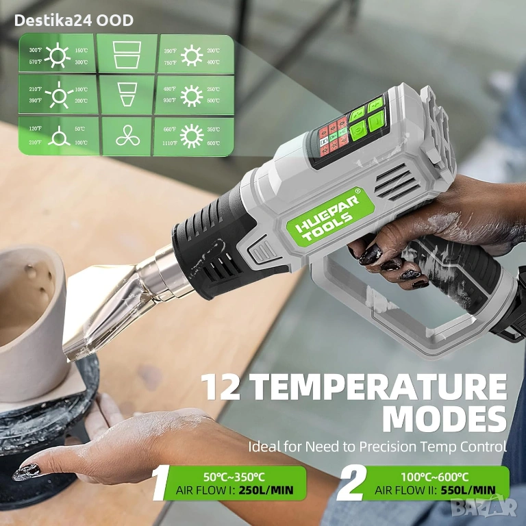 Професионален пистолет за горещ въздух Huepar Tools 2000W с бързо загряване и прецизен контрол на температурата. Подходящ за сваляне на боя, термосвиваем шлаух, ремонти, електроника, авто дейности, занаяти и DIY проекти. Загрява за около 1.5 секунди и предлага широк температурен диапазон за различни приложения.
