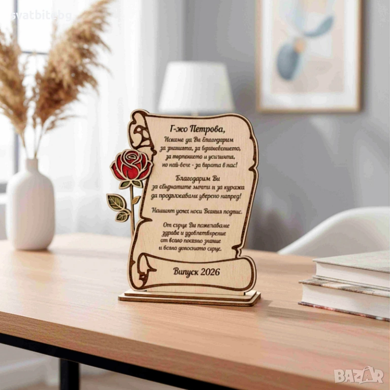 Лазерно рязане и гравиране с текст и дизайн по ваш избор, възможност за лично послание и вътрешно гравиране.