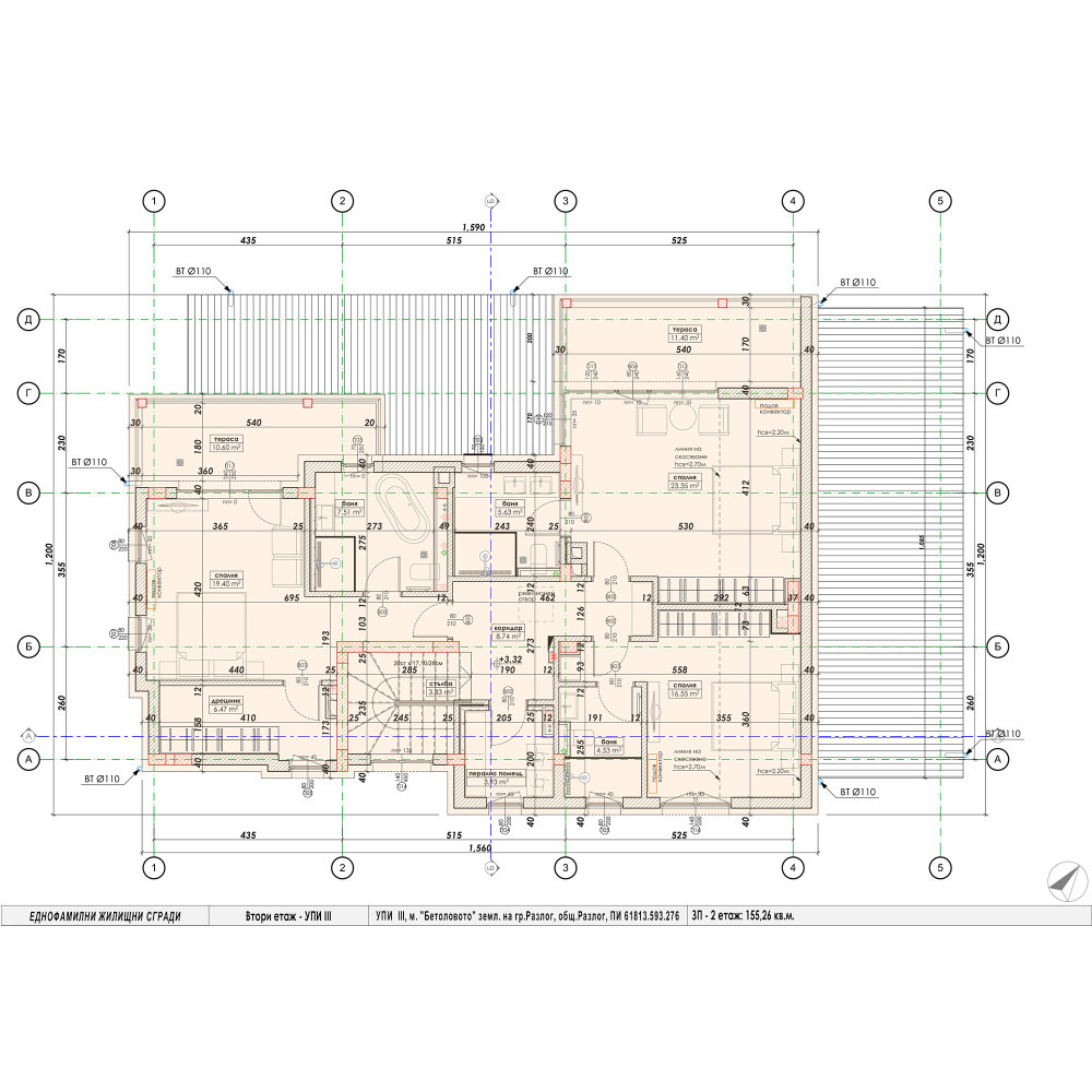 Втори етаж (156 кв.м.): 3 спални с бани и перално помещение.