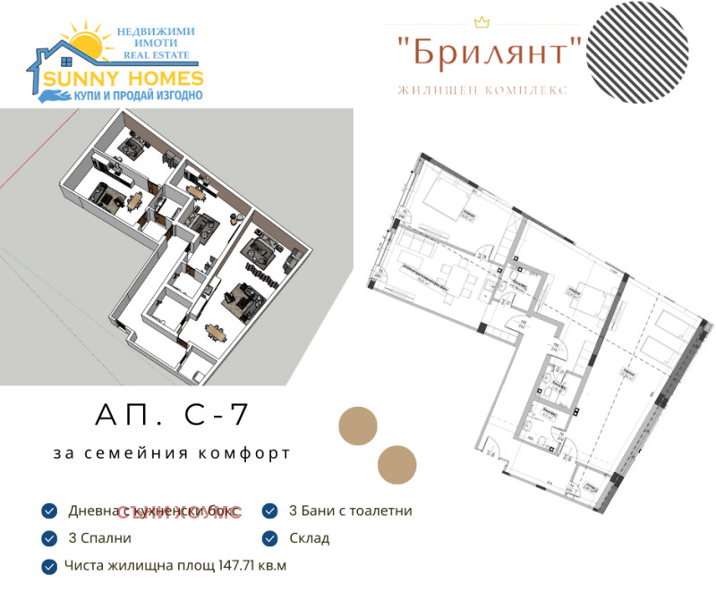 Имотът е с обща квадратура 172,65 кв. м. Чистата жилищна площ е 149,71 м. разпределени между: всекидневна с кухненски бокс в един обем, три спални, три бани с тоалетни, коридор, складово помещение.