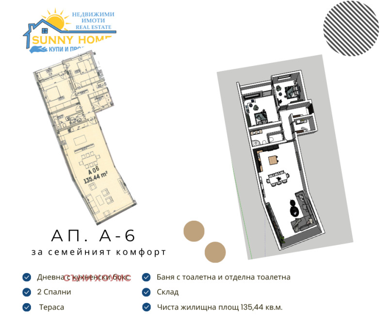 Имотът е с обща квадратура 150,19 кв. м. Чистата жилищна площ е 135,44 кв. м. разпределени между: просторна всекидневна и кухненски бокс в един обем, две спални, баня с тоалетна, тоалетна, коридор, тераса, склад/ мокро помещение.