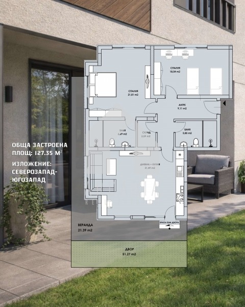 Разположението на стаите е следното - голяма дневна с кухненски бокс, две големи спални, входно антре,две бани с две тоалетни,склад, веранда 22кв.м.и собствен двор-51кв.м.. Жилището се предлага на шпакловка и замазка, входна блиндирана врата, ПВЦ-дограма от най-висок клас., монтирани ключове и контакти.