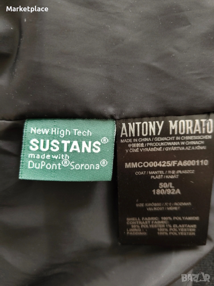 Мъжко яке бомбер на марката Антони Морато в отлично състояние без забележки. Циповете са метални. Пълнежа е високотехнологичен и е много топло. Размер Large 50.