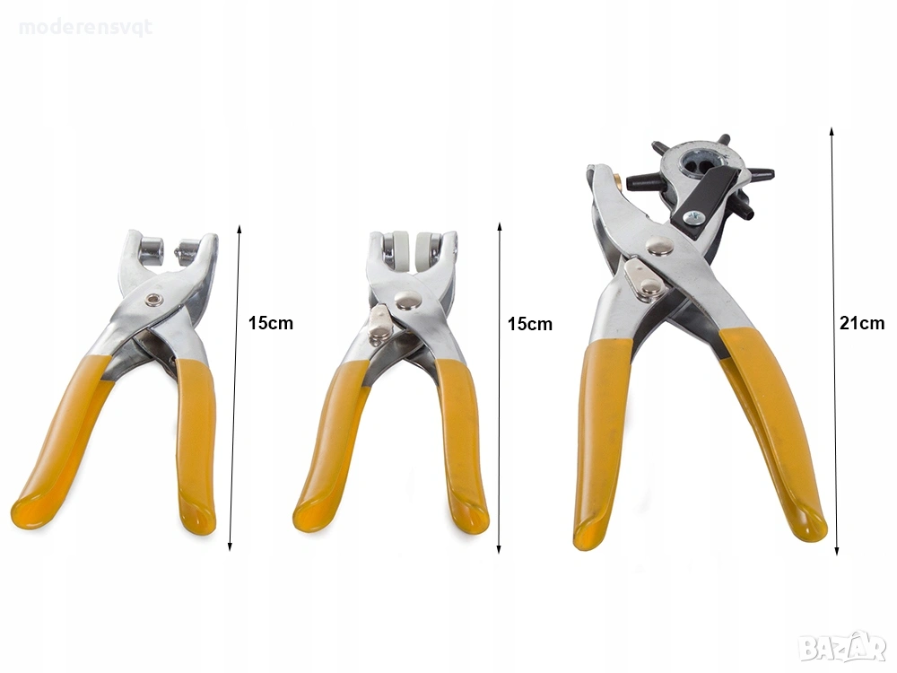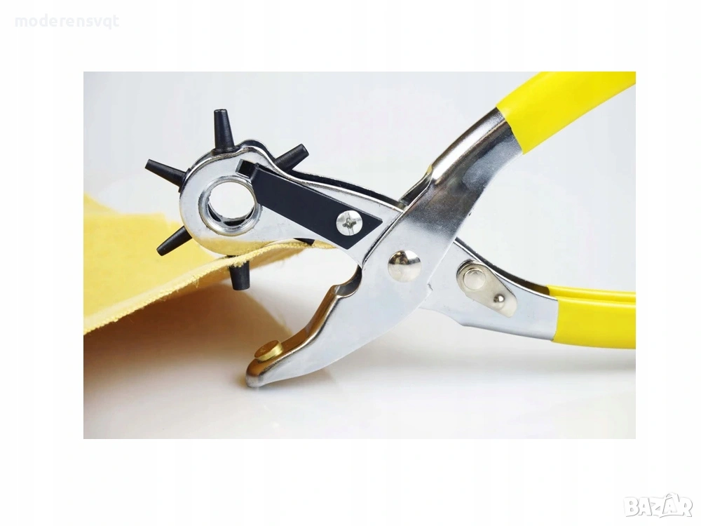 Клещи револверни - това е ротационен инструмент за правене на отвори с различни размери: 2 мм, 2,5 мм, 3 мм, 3,5 мм, 4 мм, 4,5 мм. С този инструмент можете лесно да правите отвори в кожа, текстил, пластмаса, картон и др.