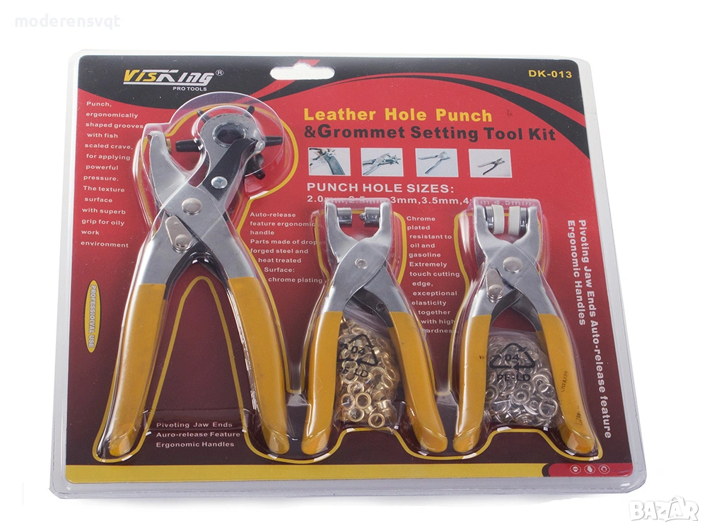 Комплектът включва три инструмента за обработка на кожа и комплект опъващи щифтове и нитове