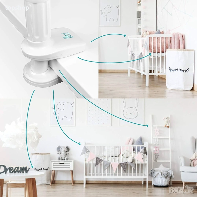 Без пробиване: Стойката се закрепва чрез здрава стяга (щипка) към ръба на кошарата, скрина, перваза на прозореца или етажерка.