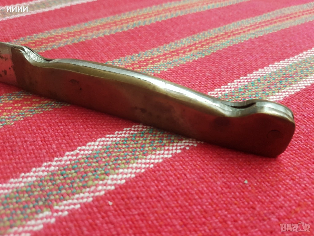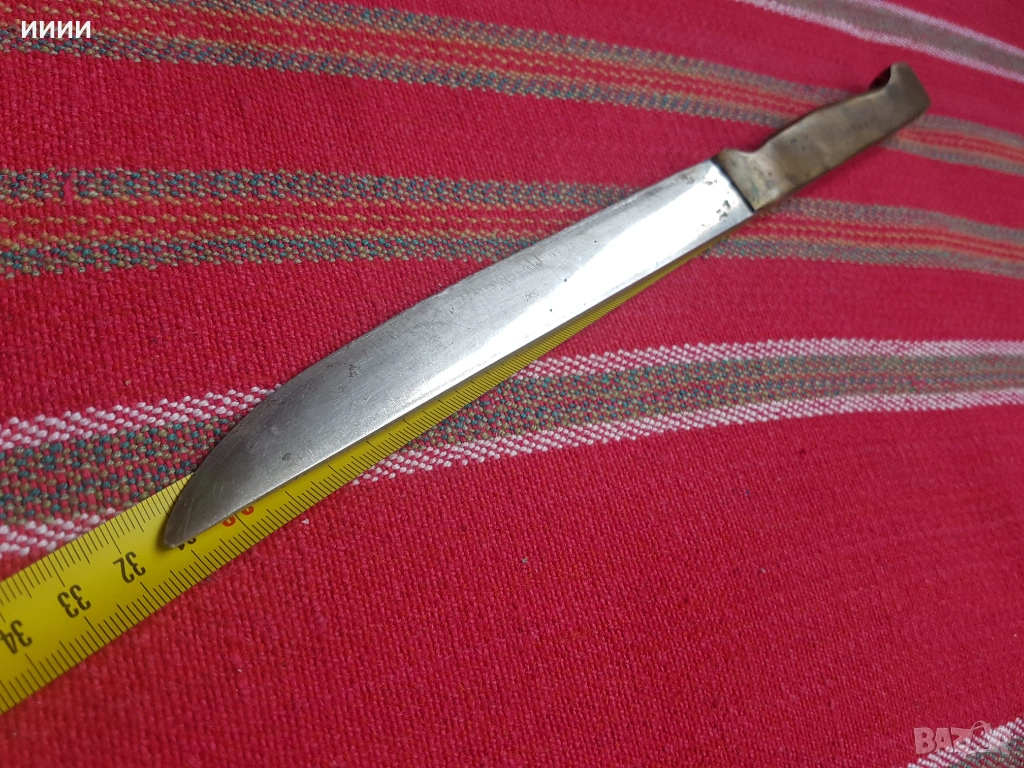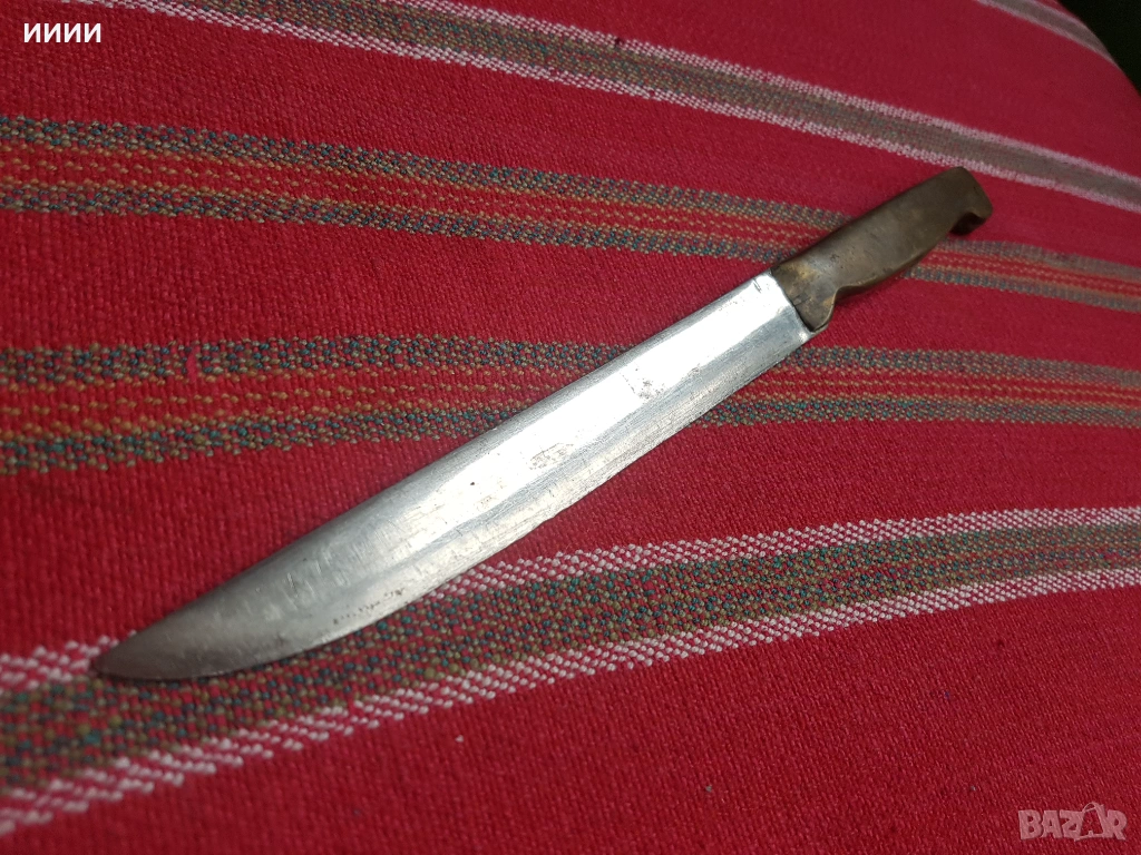 Острие от неръждаема стомана с дебелина 4 мм, а дръжката му е медна. Без кания.