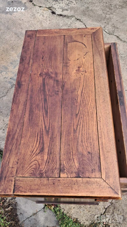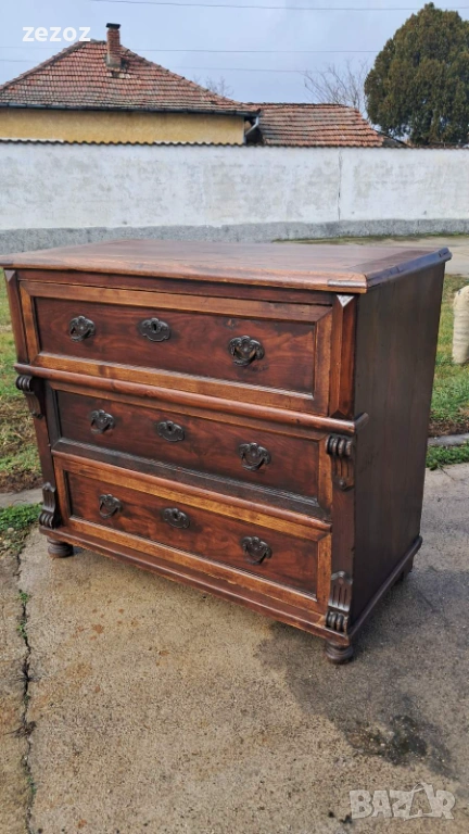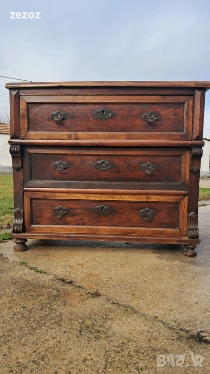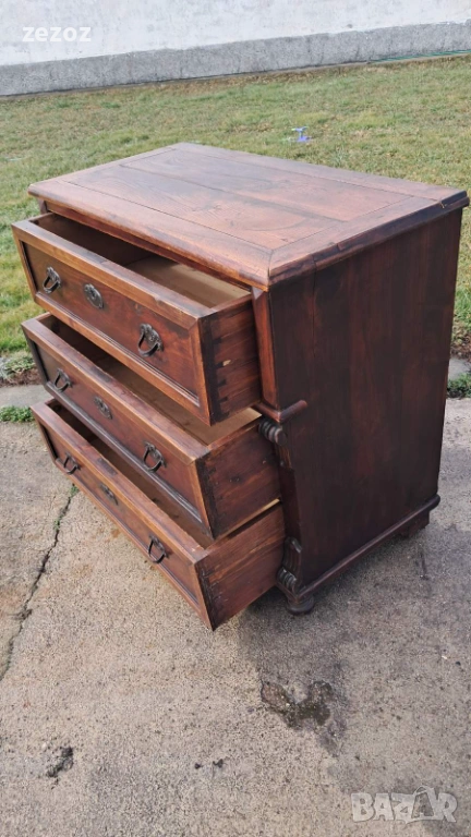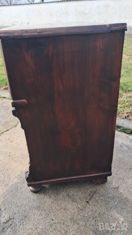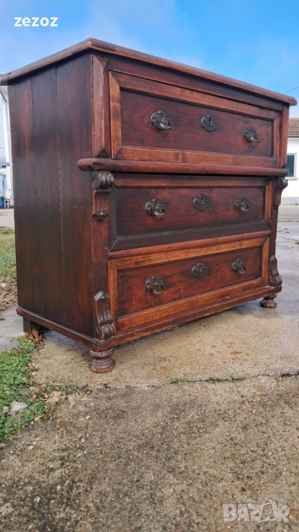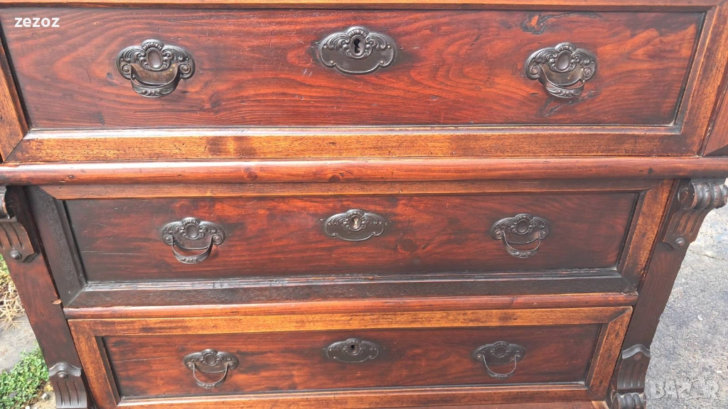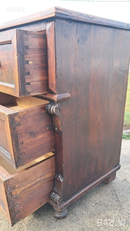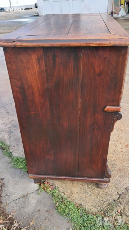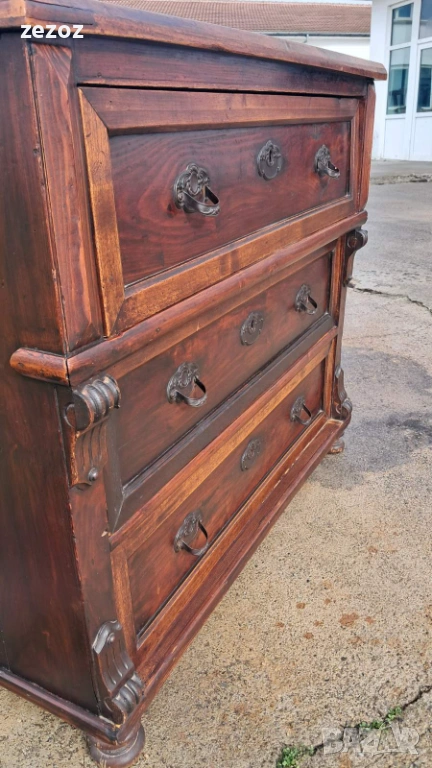 Антикварен скрин,изработен изцяло от масив.За годините си е в много добро състояние,в оригиналния си вид.Снимките са част от описанието.Горната част е леко издадена от долната с двете чекмеджета.Липсва ключ.Поради възрастта си има патина по дървото.Конструктивно здрав.Размери-