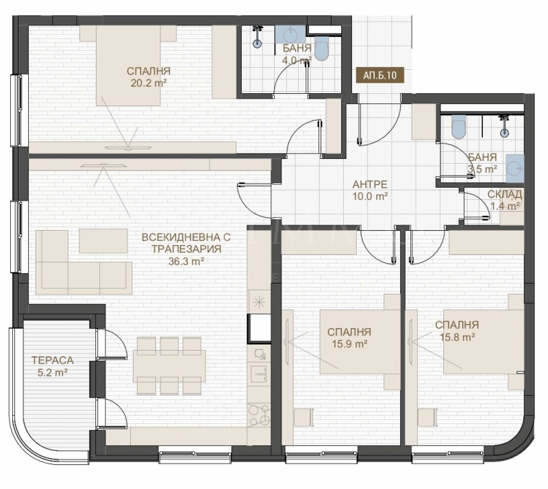 Жилището с обща площ от 157,03 кв.м е разположено на 4-ти етаж от 7.