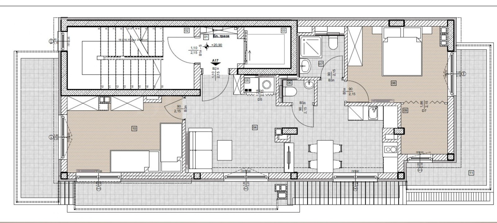 В строителството са използвани материали от премиум клас, осигуряващи дълговечност и лесна поддръжка на сградата във времето. Архитектурният план предвижда подземно ниво с паркоместа.