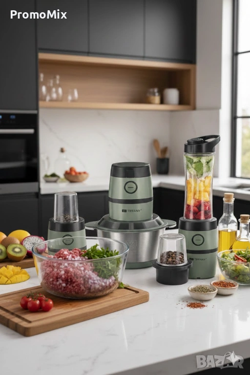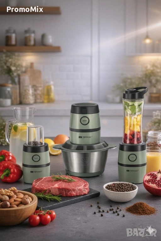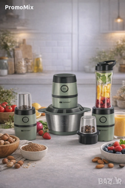 Tiffany TF2003 комбинира 3 уреда в 1 - блендер, чопър и мелничка за кафе, ядки, семена и др.