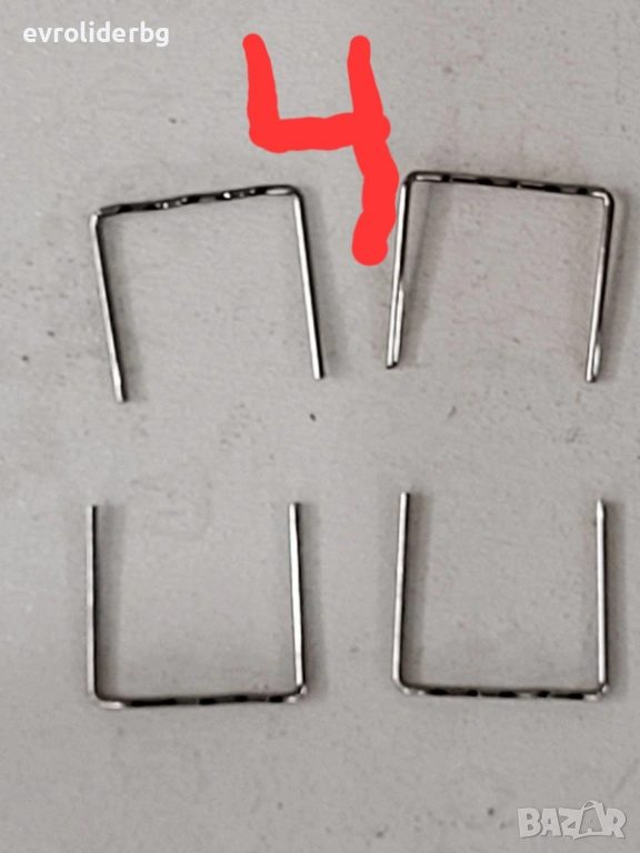 4) Снимка с надпис №4 Скоби "П"- ОБРАЗНИ ЗА ПРЕЦИЗНИ ПОПРАВКИ. Подходящи за тънки и прави пукнатини. Материал: Неръждаема стомана - Дебелина: 0.8мм. Тегло на продукта: 12грама. 100броя в пакет.