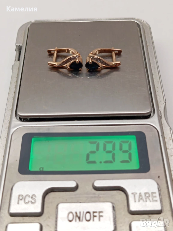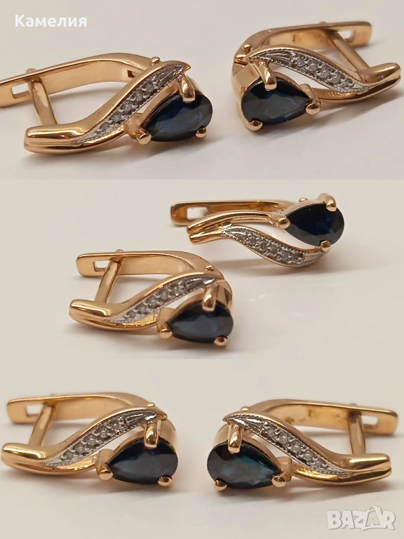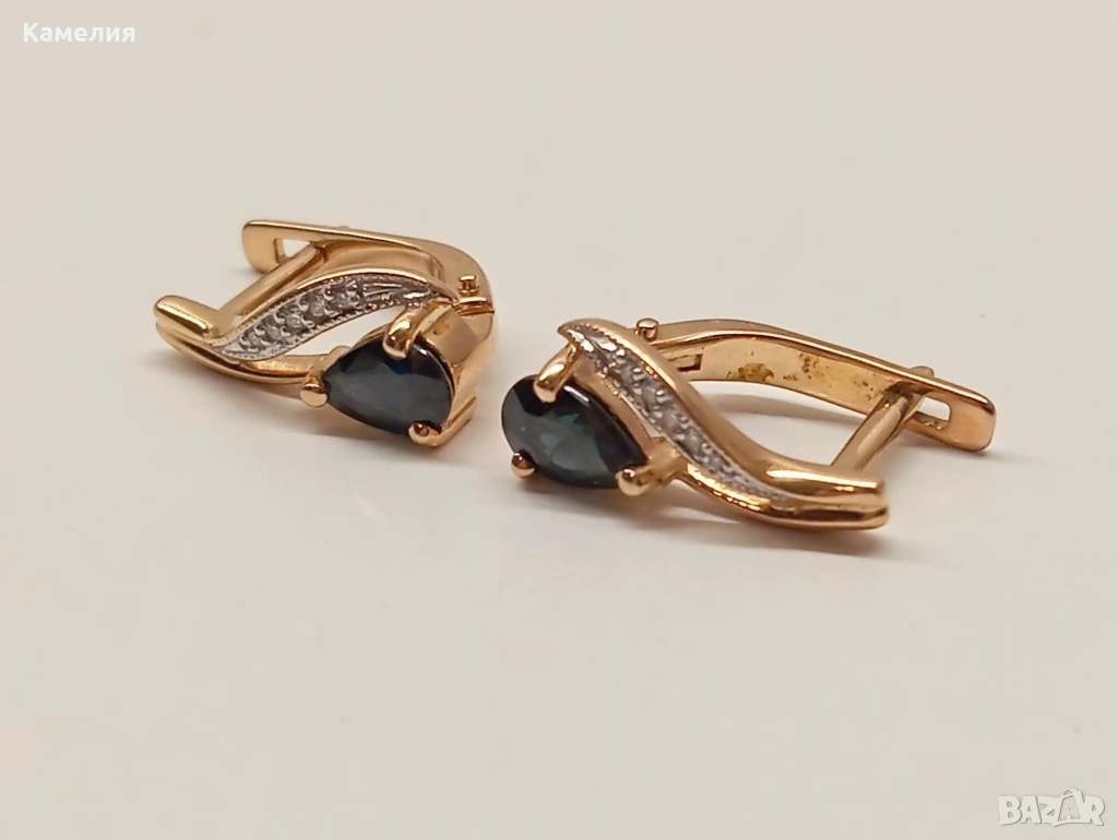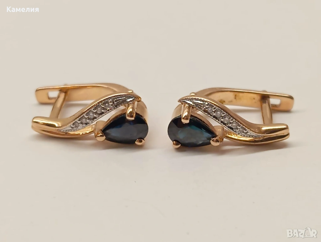 Руски златни обеци с брилианти и сапфири. Проба 585 глава с кокошник. Грамаж 2,99 грам. 425 евро ( 830 лв).