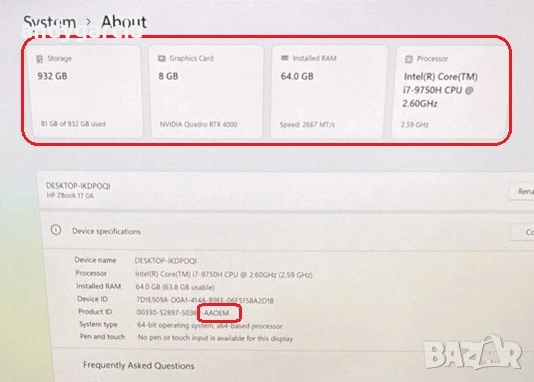Продава се лаптоп, оригиналното 200W зарядно + вграден лиценз на дъното със стикер за Windows 10/11 Pro + неоригинална кутия за лаптоп.