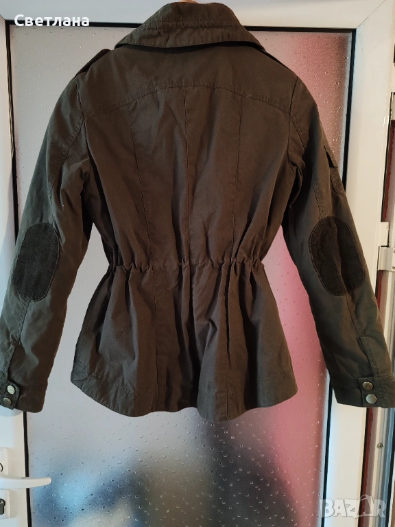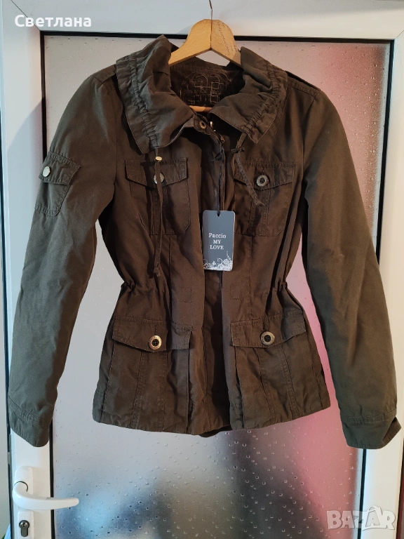 Ново пролетно есенно яке. Цвят какви. Размер S. По етикет размер 38, но според мен е подходящо за S или малък М. Размери: от рамо до рамо 40 см. Гръдна 96 см, талия 90 см опъната, но се регулира с ластик. Дължина на якето 65 см.