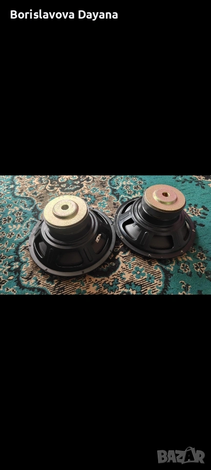 информация за ватове или омове не са налични , говорители те работят перфектно единственият проблем е че гофрите бяха леко напукани на едно две места и са намазани с по малко силикон но смисъл забележките не пречат те да си свирят както подобаващо но за да бъдат перфектни по желание на новият собственик гофрите може да си ги поднови с нови за повече информация пишете на лично или се свържете на посочения номер при интерес пращам по Еконт....