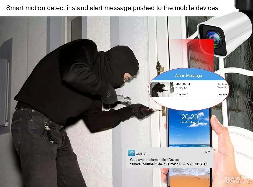 * Интелигентна детекция на движение: Системата позволява настройка на зони за движение и изпраща незабавни известия (push notifications) към мобилното устройство при засичане на активност, спестявайки време за преглед на статични записи.