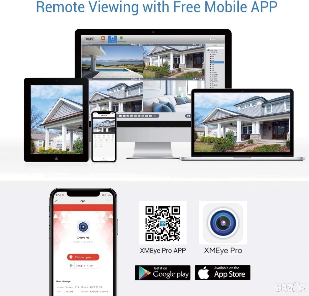 * Отдалечен достъп (P2P): Възможност за наблюдение в реално време и преглед на записи от всяка точка на света чрез смартфон (iOS/Android) или компютър, посредством облачната P2P услуга и приложението XMEye Pro.