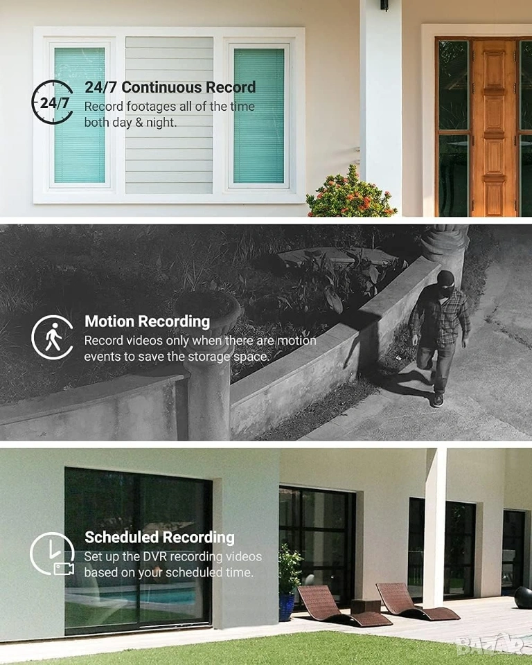 * 5MP Super HD Резолюция: Поддържа запис и възпроизвеждане на видео с висока разделителна способност (до 2592 x 1920), осигурявайки значително по-детайлна картина в сравнение със стандартните 1080p системи.