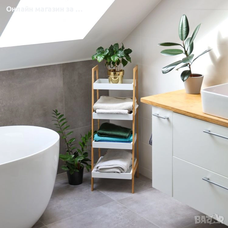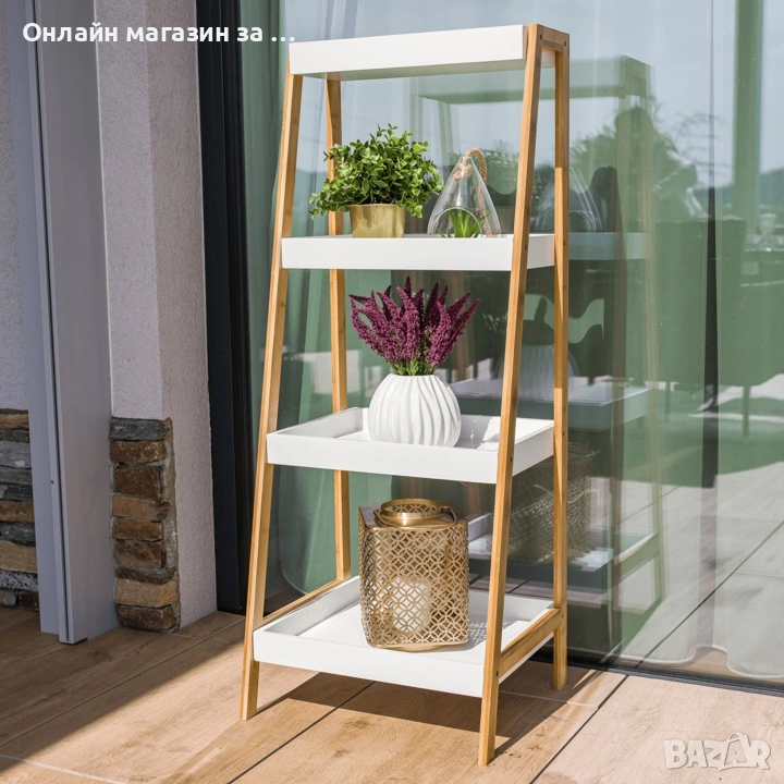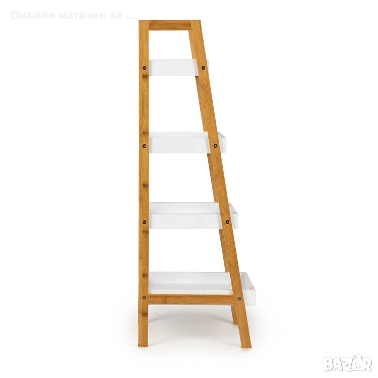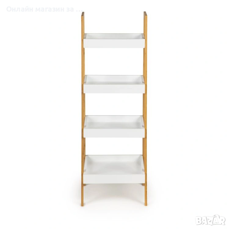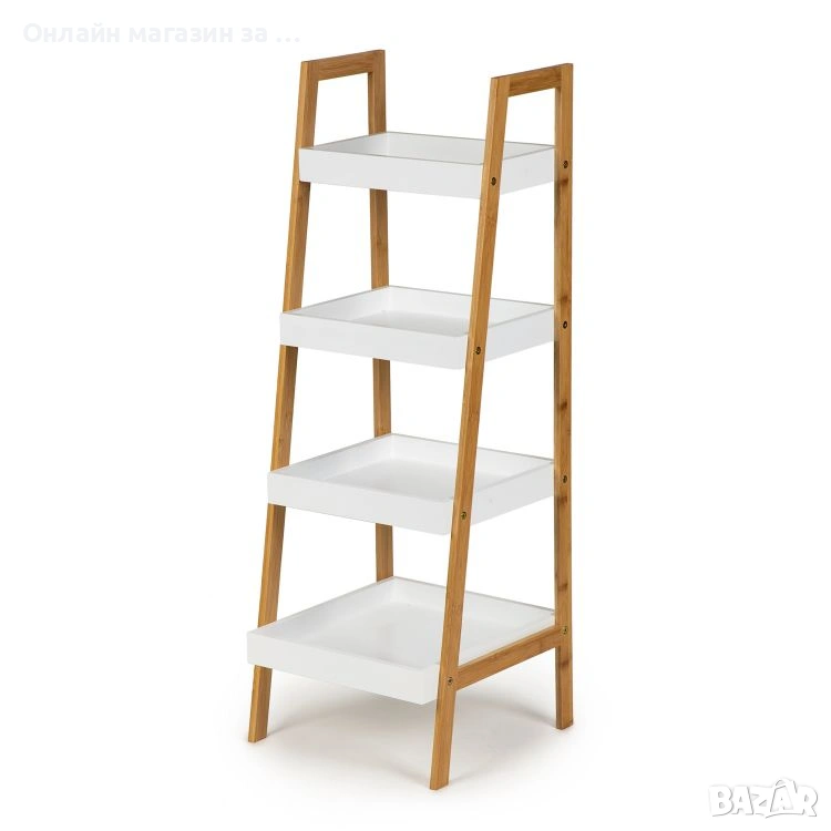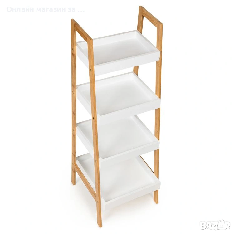 Краката на шкафа са изработени от здраво бамбуково дърво . Етажерка е универсална, защото е подходяща за баня, хол, спалня или офис . Четири просторни практични рафта са изработени от боядисана МДФ плоскост . Използваните материали са с високо качество, добре обработени - без остри ръбове . Продукт за самостоятелно сглобяване, според ясни инструкции на английски език.