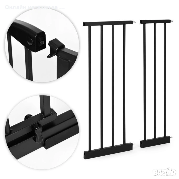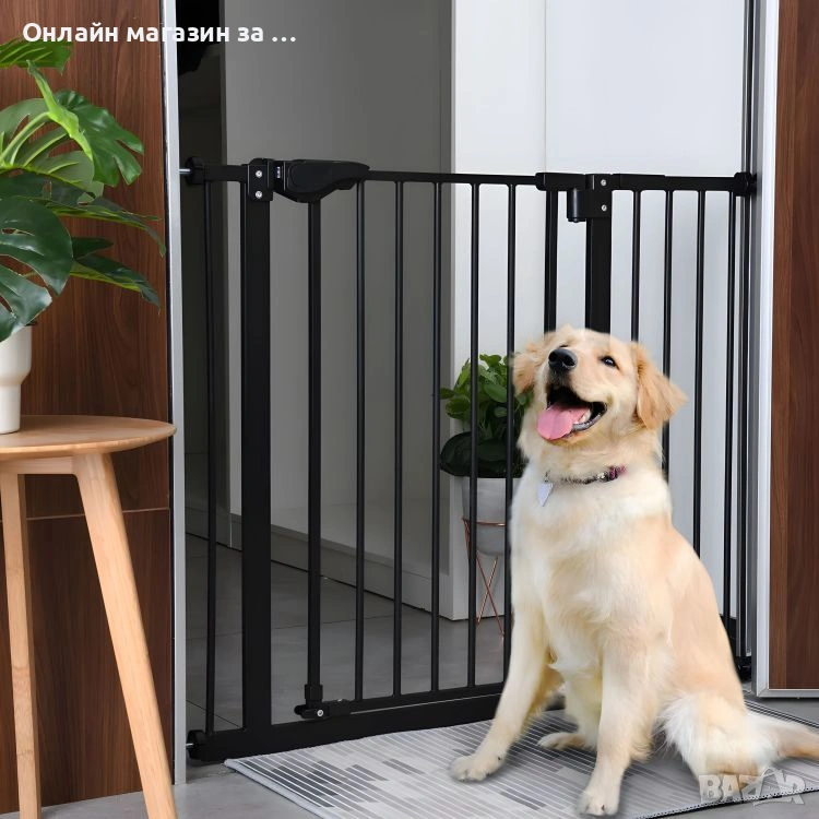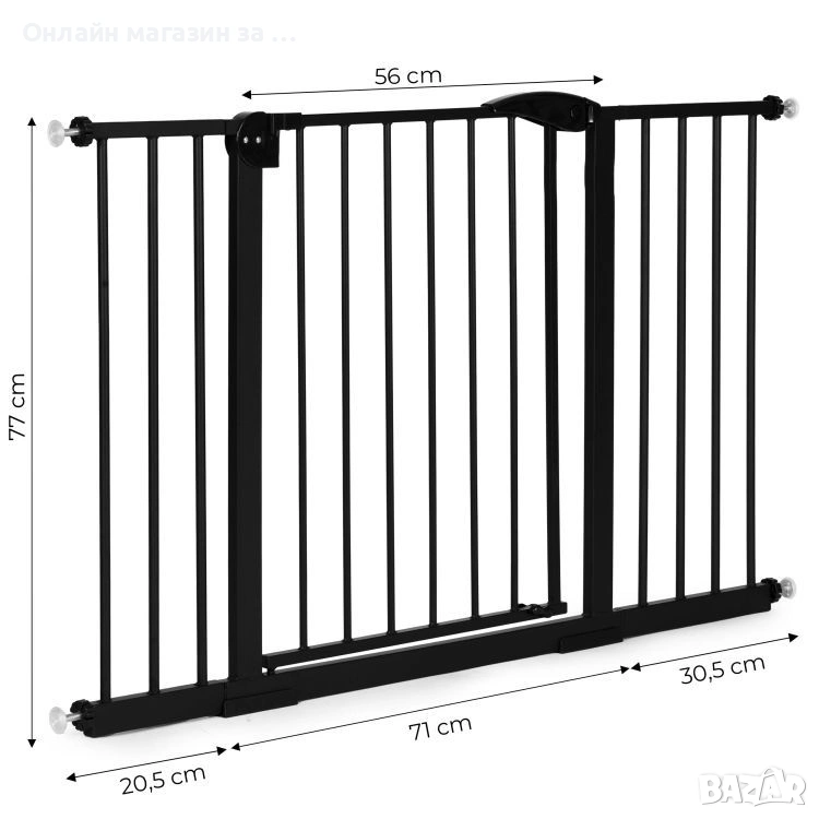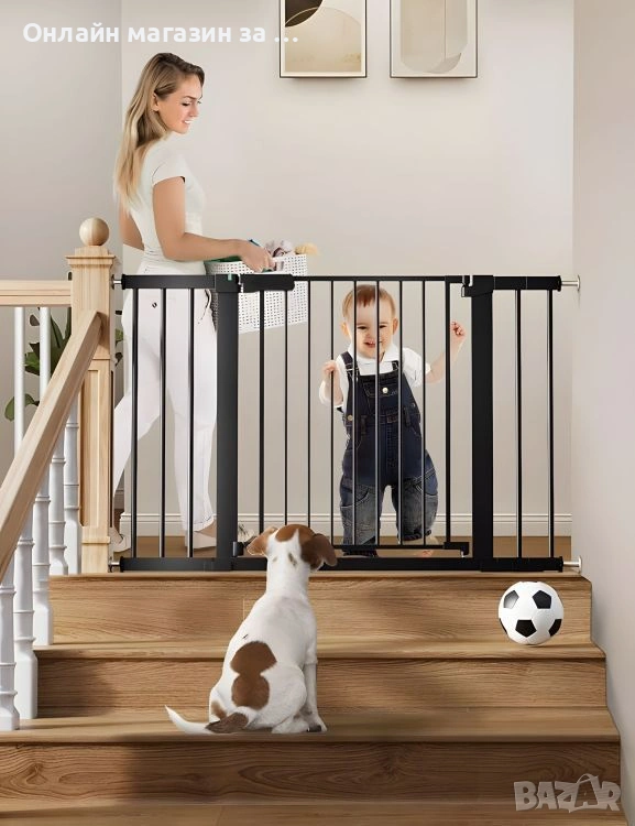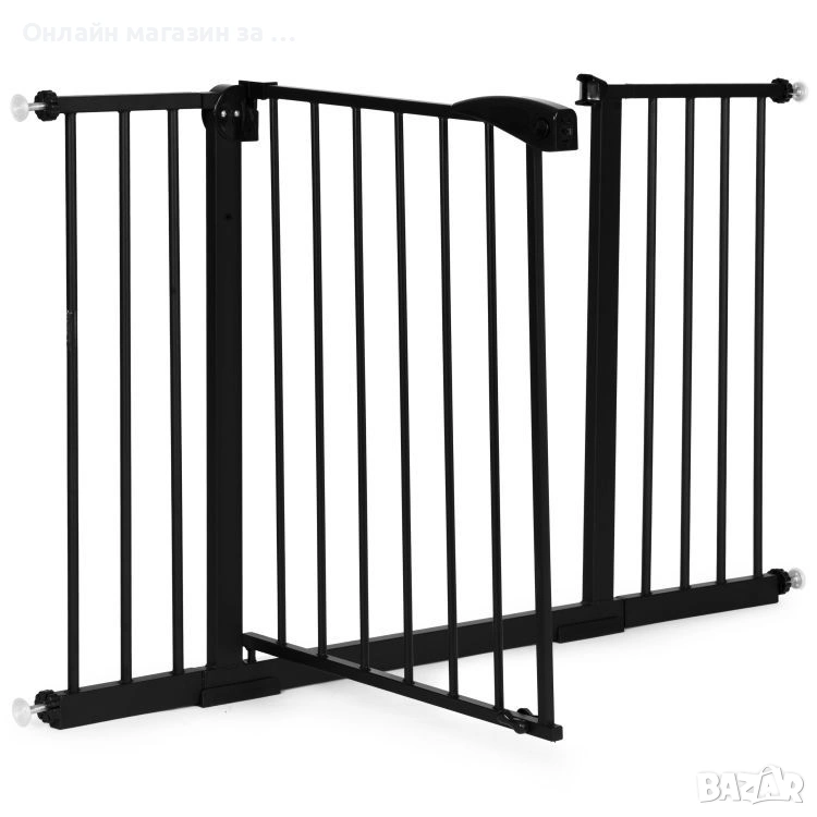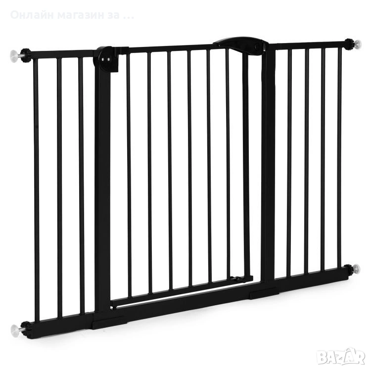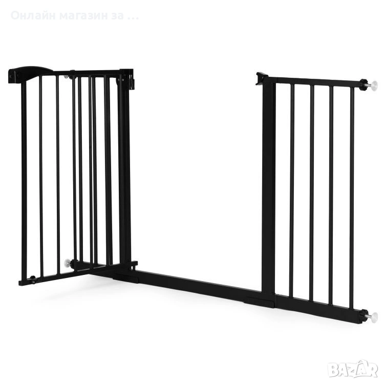 Предпазна преграда за деца и животни, idealSTORE, Размери 74-132 см Регулируема ширина, Височина 77 см, Монтаж под налягане без пробиване, Електростатично боядисана стомана, отваряне от двете страни, Автоматично затваряне, Разтегателна и устойчива, Черна