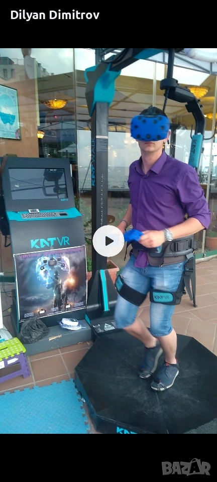 платформа за пълно потапяне в света на виртуалната реалност! Подходяща е за бизнес по курорти, панаири, сборове , детски кътове и аркадни зали. Комплектът включва KAT VR платформа, очила за виртуална реалност HTC Vive, мощен компютър със специализиран софтуер и игри, аксесоари. Устройството осигурява изключително реалистично движение във VR – ходене, тичане, обръщане във всички посоки. Платформата може да се тества на място.